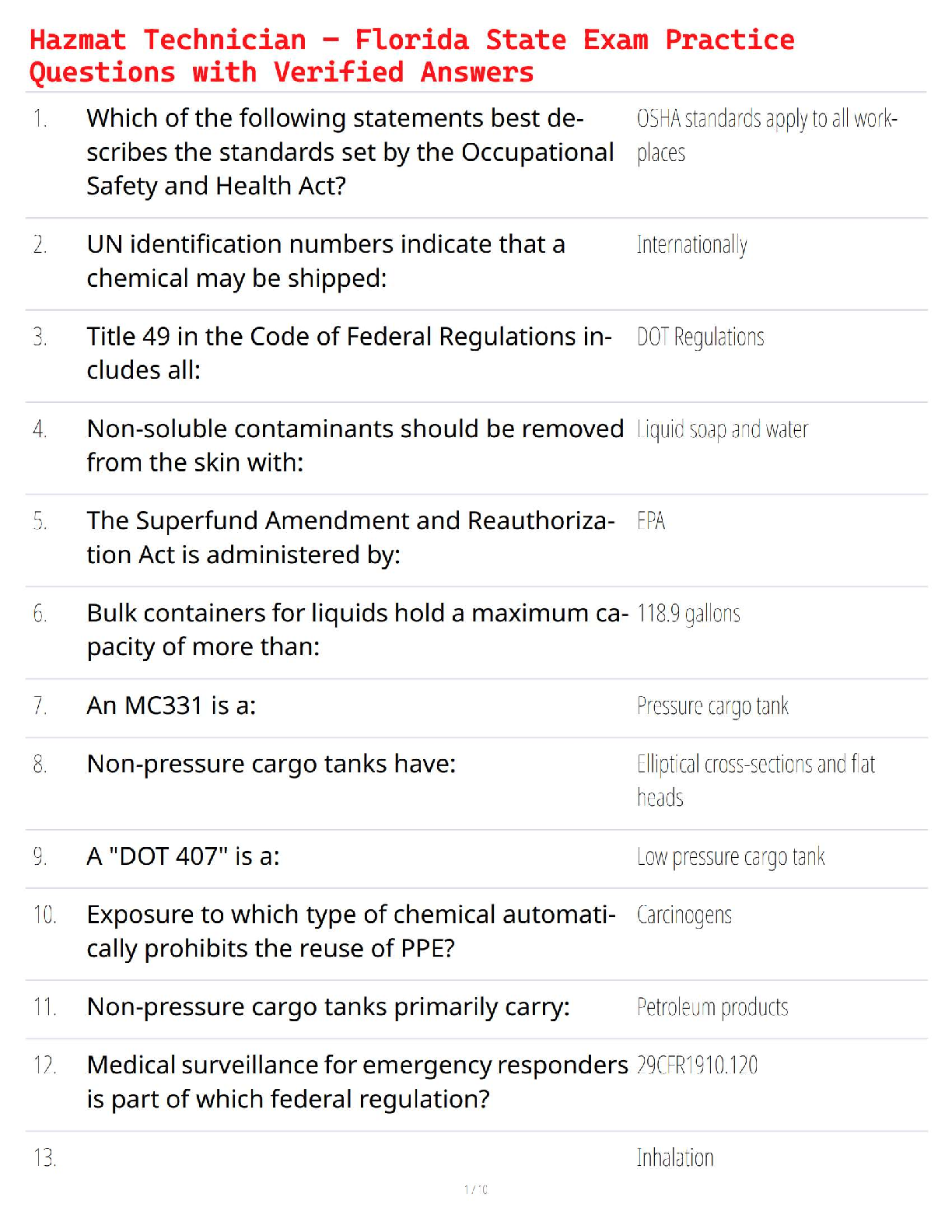Capstone Exam > QUESTIONS and ANSWERS > Hazmat Technician – Florida State Exam Practice Questions with Verified Answers (All)