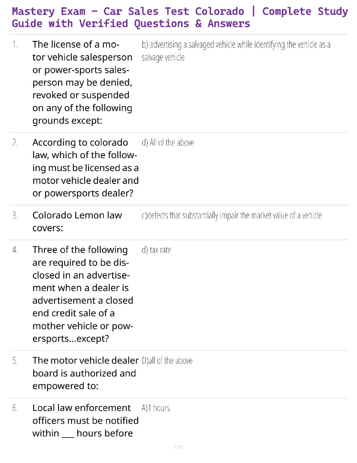 Capstone Exam > QUESTIONS and ANSWERS > Mastery Exam – Car Sales Test Colorado | Complete Study Guide with Verified Questions & Answers (All)