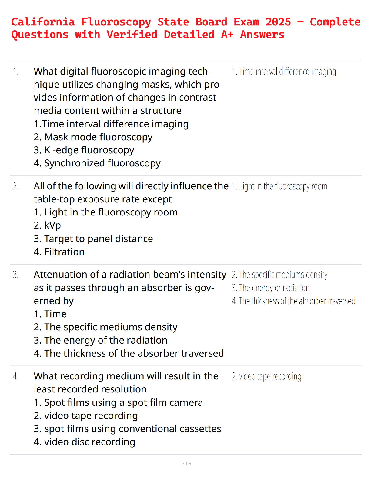 Capstone Exam > QUESTIONS & ANSWERS > California Fluoroscopy State Board Exam 2025 – Complete Questions with Verified Detailed A+ Answers (All)