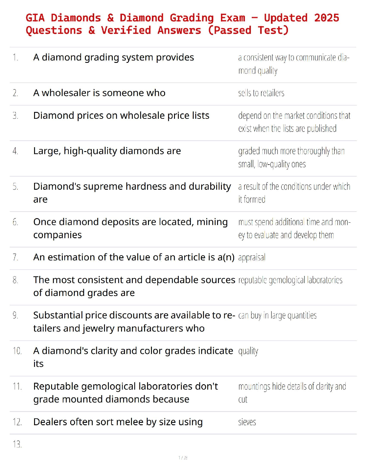 Capstone Exam > EXAM > GIA Diamonds & Diamond Grading Exam – Updated 2025 Questions & Verified Answers (Passed Test) (All)