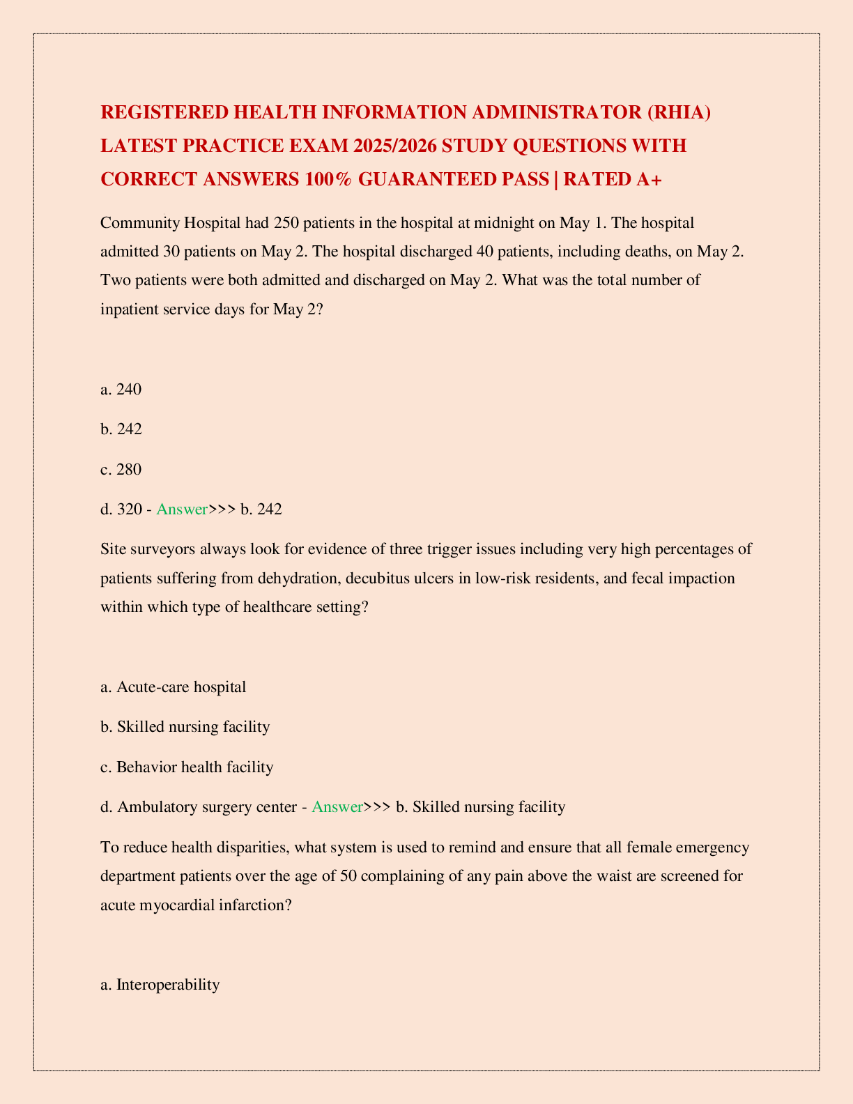 RHIA > EXAM > REGISTERED HEALTH INFORMATION ADMINISTRATOR (RHIA) LATEST PRACTICE EXAM 2025/2026 STUDY QUESTIONS WITH CORRECT ANSWERS 100% GUARANTEED PASS | RATED A+ (All)