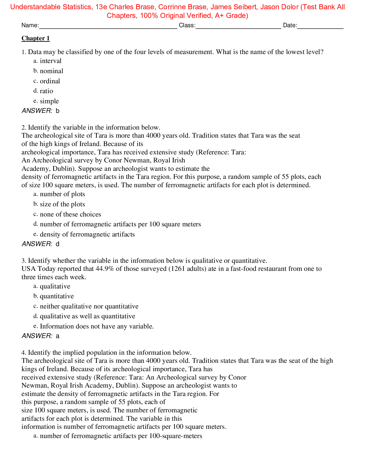 ECO 578 Statistics > TEST BANKS > Test Bank for Understandable Statistics 13th Edition By Charles Brase, Corrinne Brase, James Seibert, Jason Dolor (All Chapters, 100% Original Verified, A+ Grade) (All)