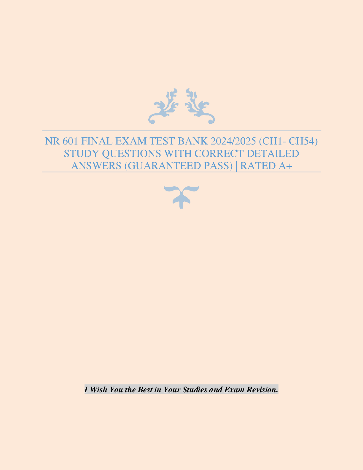 NURS611 > EXAM > NR 601 FINAL EXAM TEST BANK 2024/2025 (CH1- CH54) STUDY QUESTIONS WITH CORRECT DETAILED ANSWERS (GUARANTEED PASS) | RATED A+ (All)