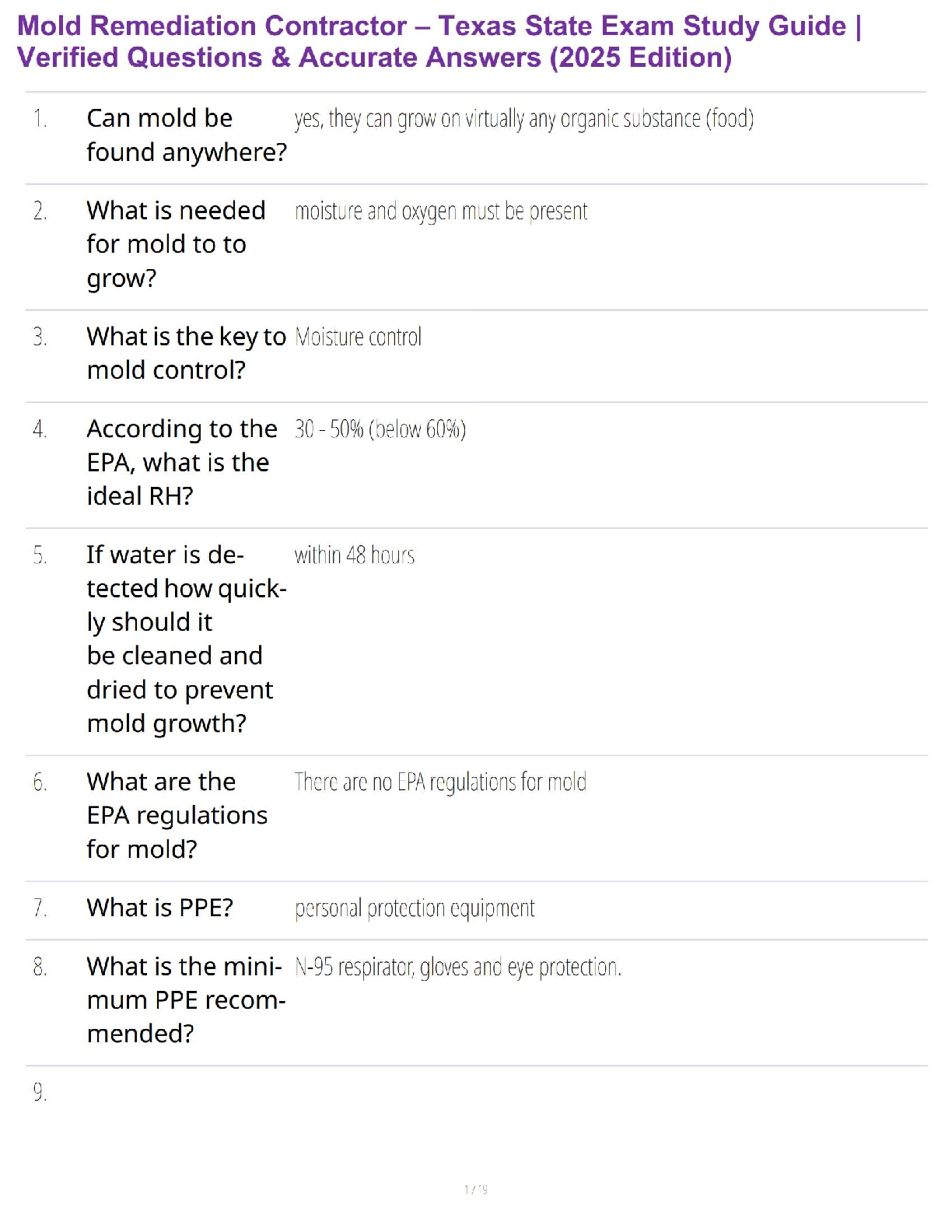 Promulgated Contracts Forms > EXAM > Mold Remediation Contractor – Texas State Exam Study Guide | Verified Questions & Accurate Answers (2025 Edition) (All)