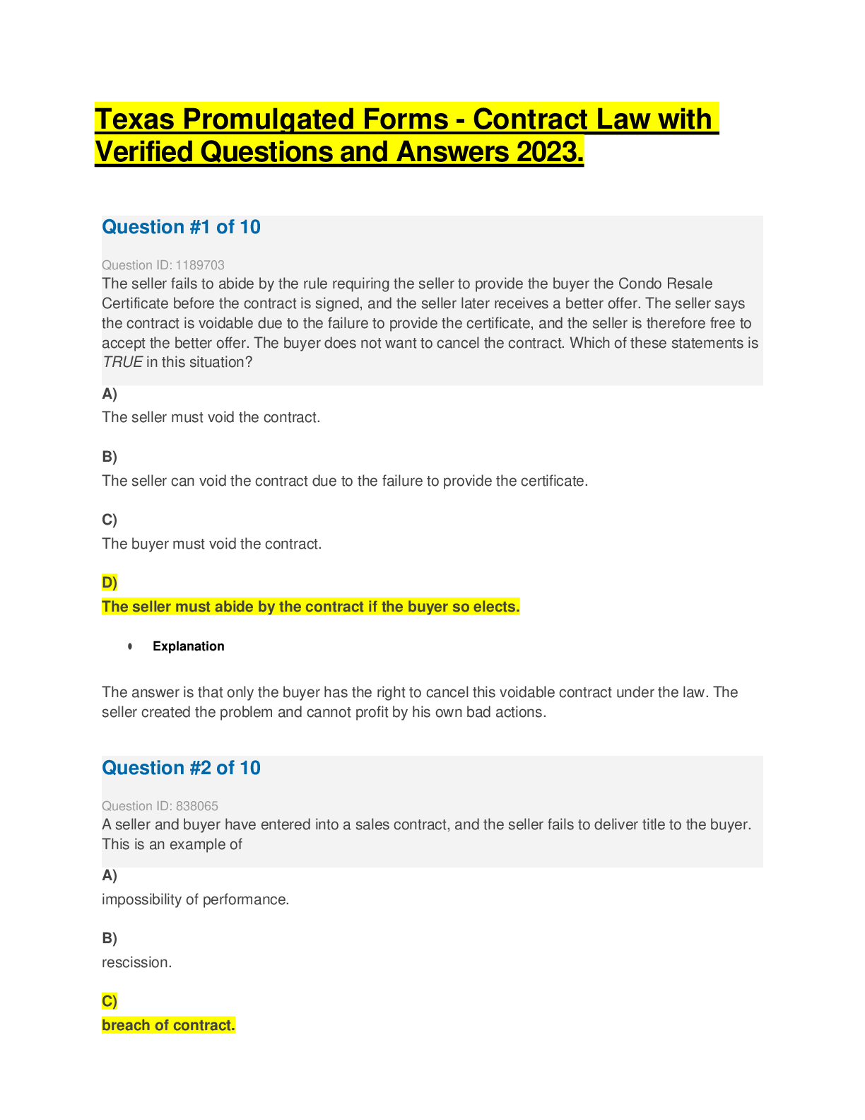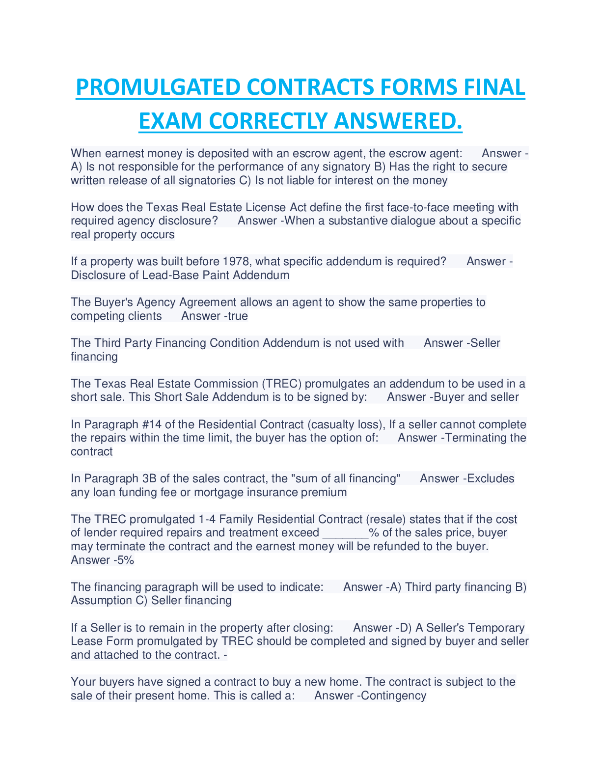 PROMULGATED CONTRACTS FORMS . > EXAM > Texas Promulgated Forms - Contract Law with Verified Questions and Answers 2023. (All)