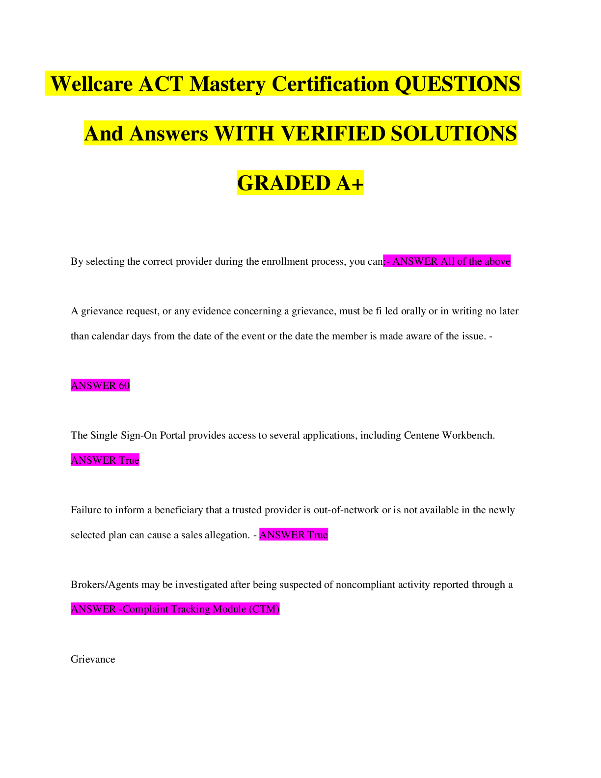 Nursing Assistant Nurse Aide Practice Exam > QUESTIONS & ANSWERS > Wellcare ACT Mastery Certification QUESTIONS And Answers WITH VERIFIED SOLUTIONS GRADED A+ (All)
