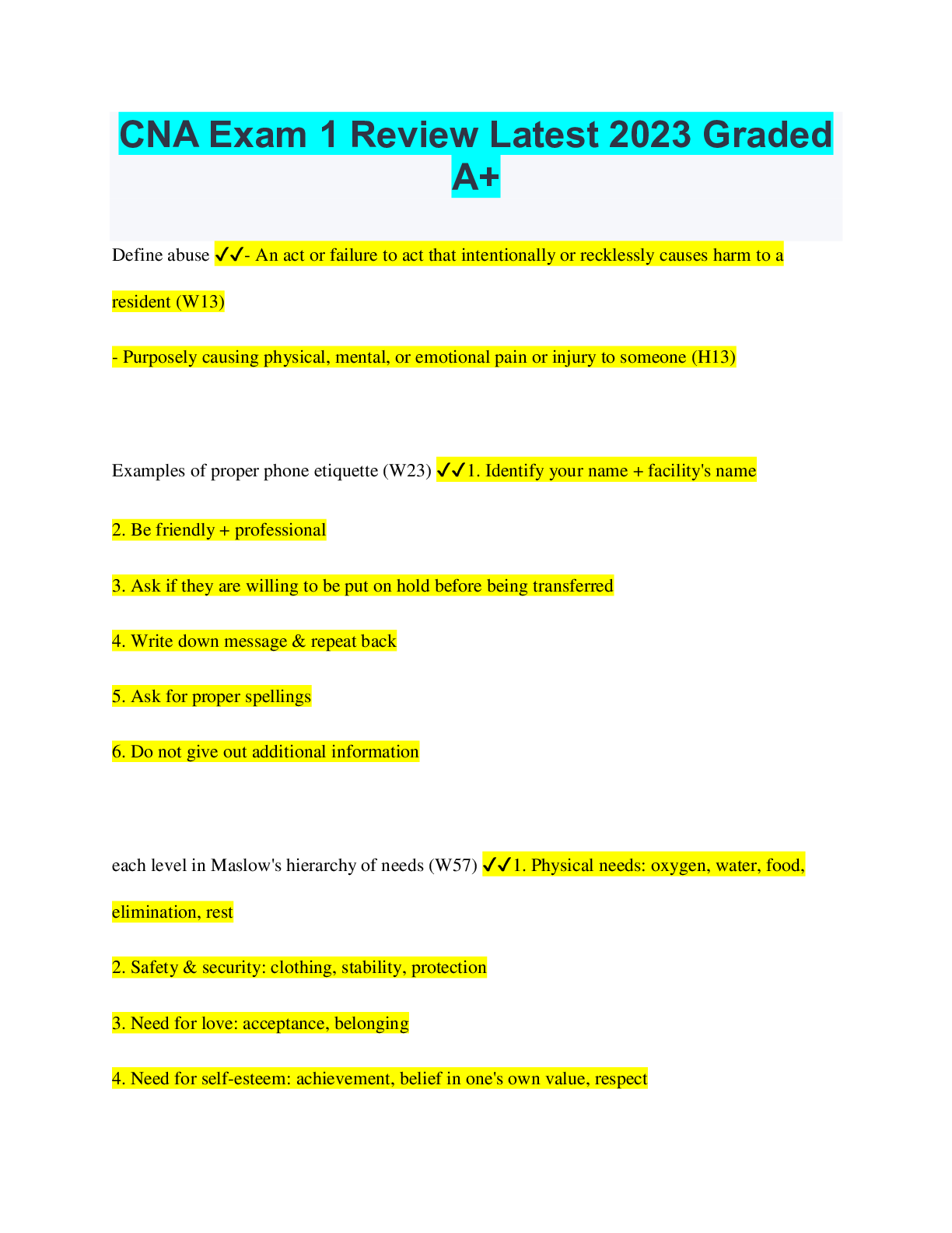 CNA - Certified Nursing Assistant > EXAM > CNA Exam 1 Review Latest 2023 Graded A+ (All)