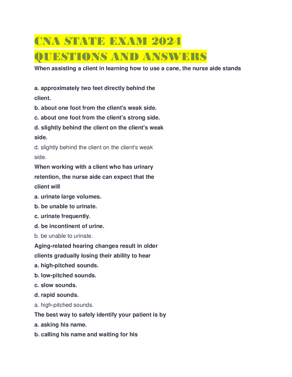 CNA - Certified Nursing Assistant > EXAM > CNA STATE EXAM 2024 QUESTIONS AND ANSWERS (All)