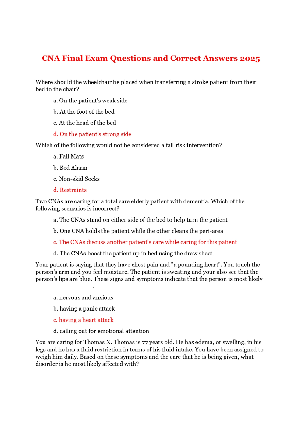CNA - Certified Nursing Assistant > EXAM > CNA Final Exam Questions and Correct Answers 2025 (All)