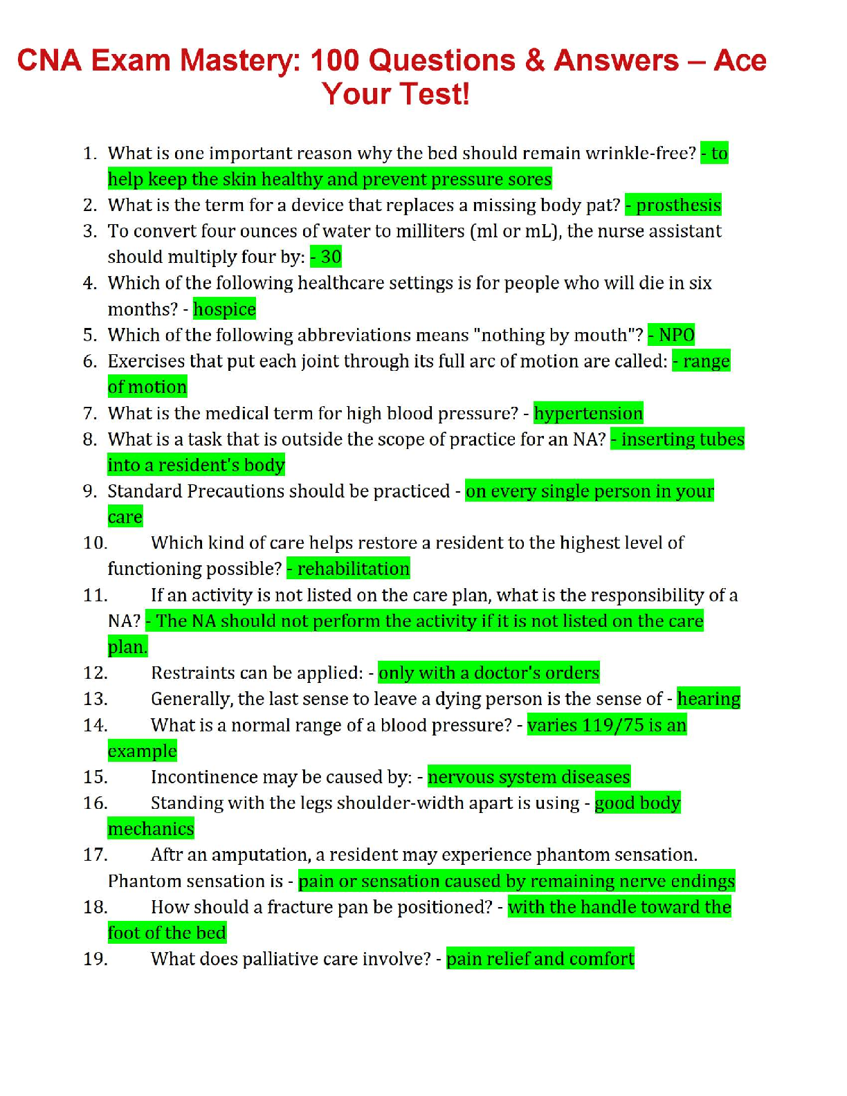 CNA - Certified Nursing Assistant > EXAM > CNA Exam Mastery: 100 Questions & Answers – Ace Your Test! (All)