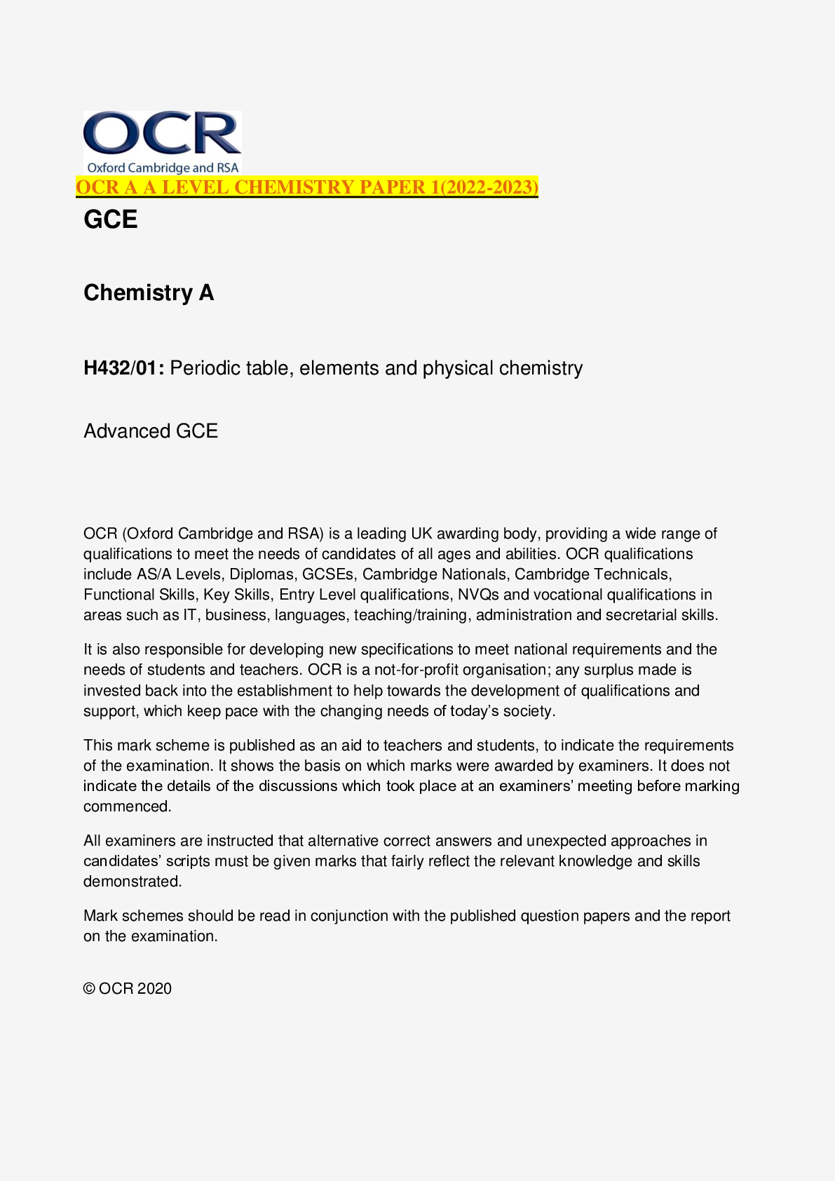NURSING. > EXAM > OCR A A LEVEL CHEMISTRY PAPER 1(2022-2023) (All)