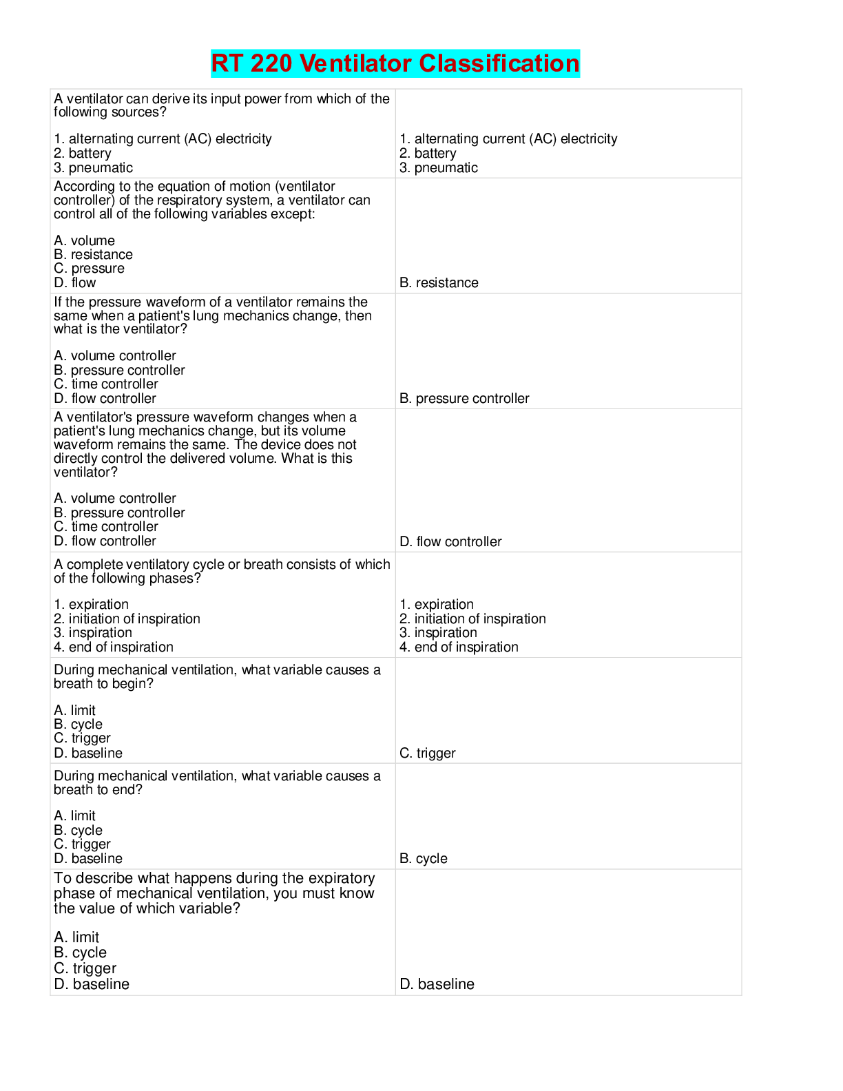NURSING. > EXAM > RT 220 Ventilator Classification - Questions and Answers (All)