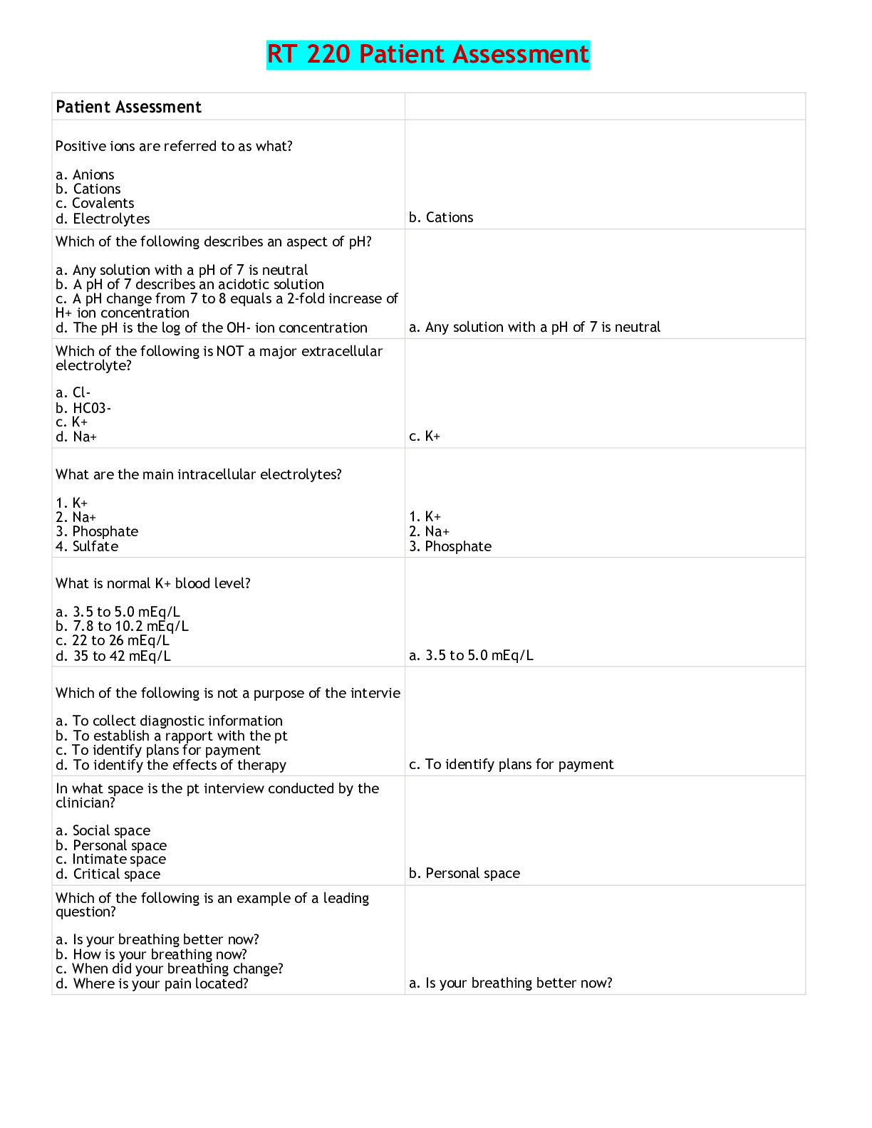 NURSING. > EXAM > RT 220 Patient Assessment Exam - Questions and Answers (All)