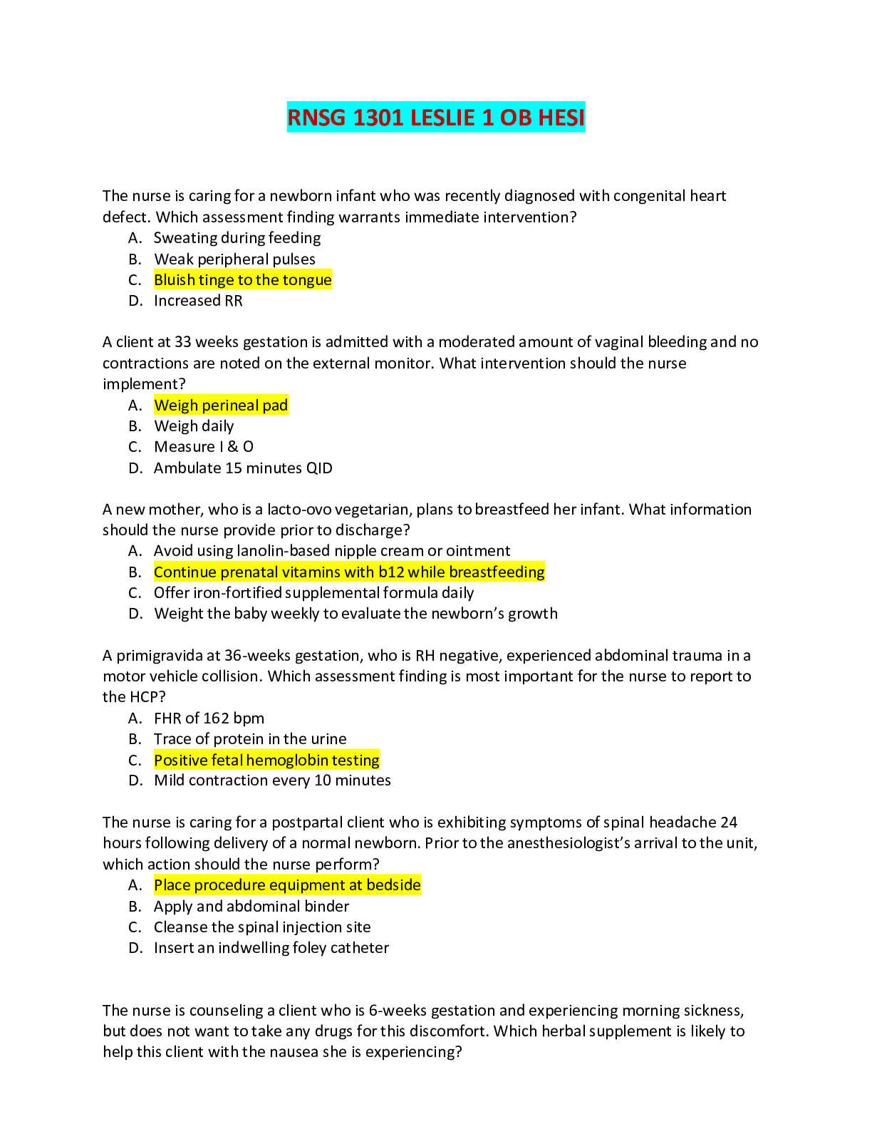 NURSING. > EXAM > RNSG 1301 LESLIE 1 OB HESI - QUESTIONS AND ANSWERS (All)