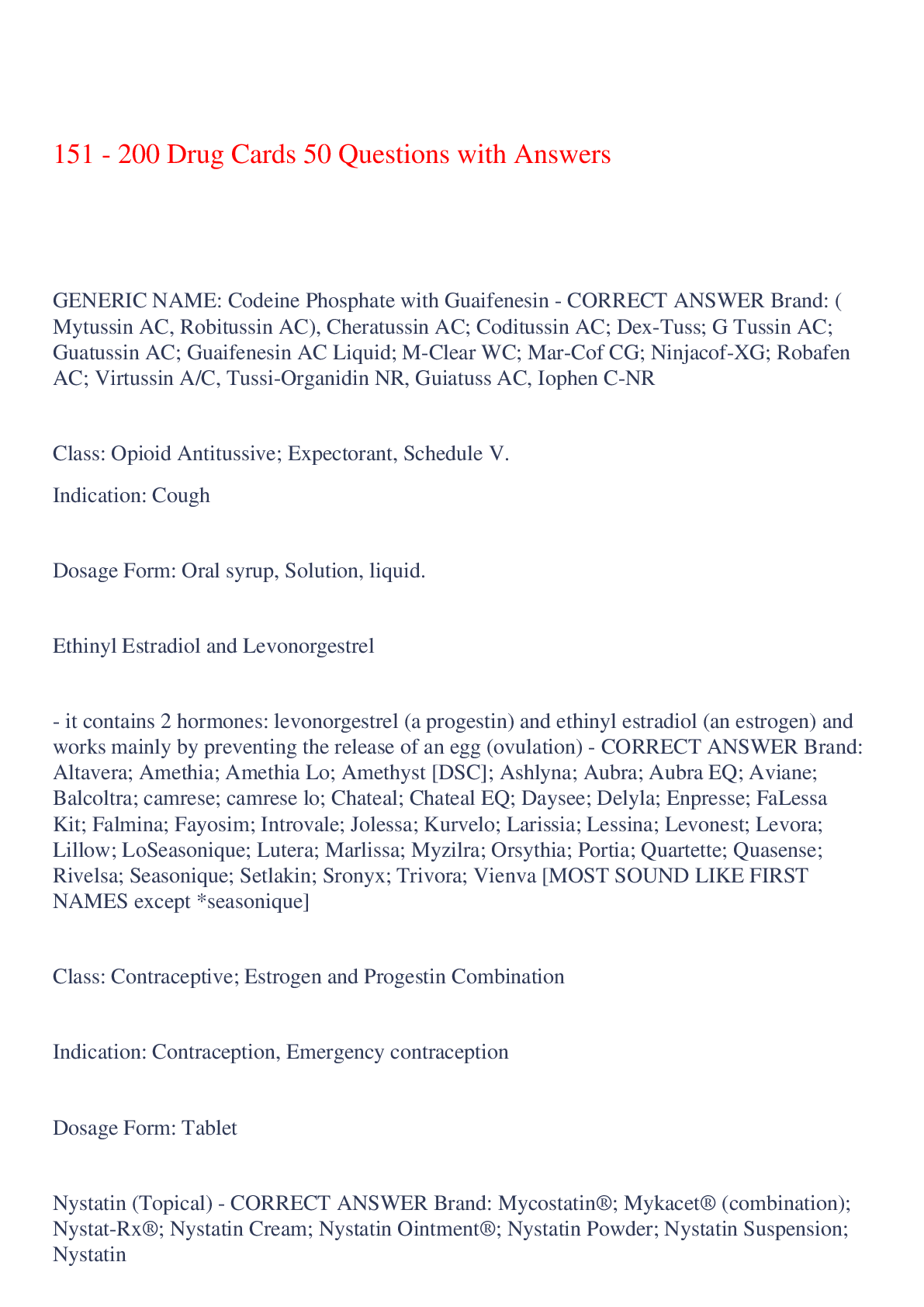 NURSING. > EXAM > 151 - 200 Drug Cards 50 Questions with Answers,100% CORRECT (All)