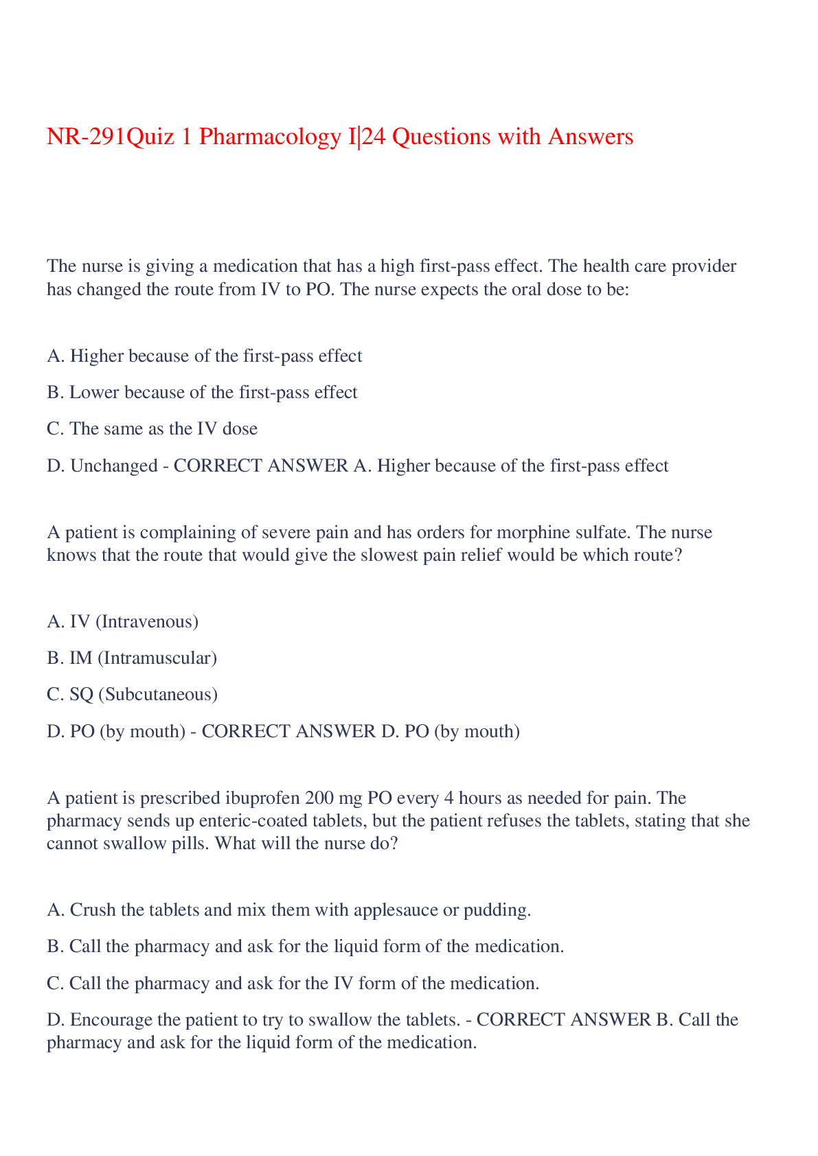 NURSING. > EXAM > NR-291 Quiz 1 Pharmacology I|24 Questions with Answers,100% CORRECT (All)