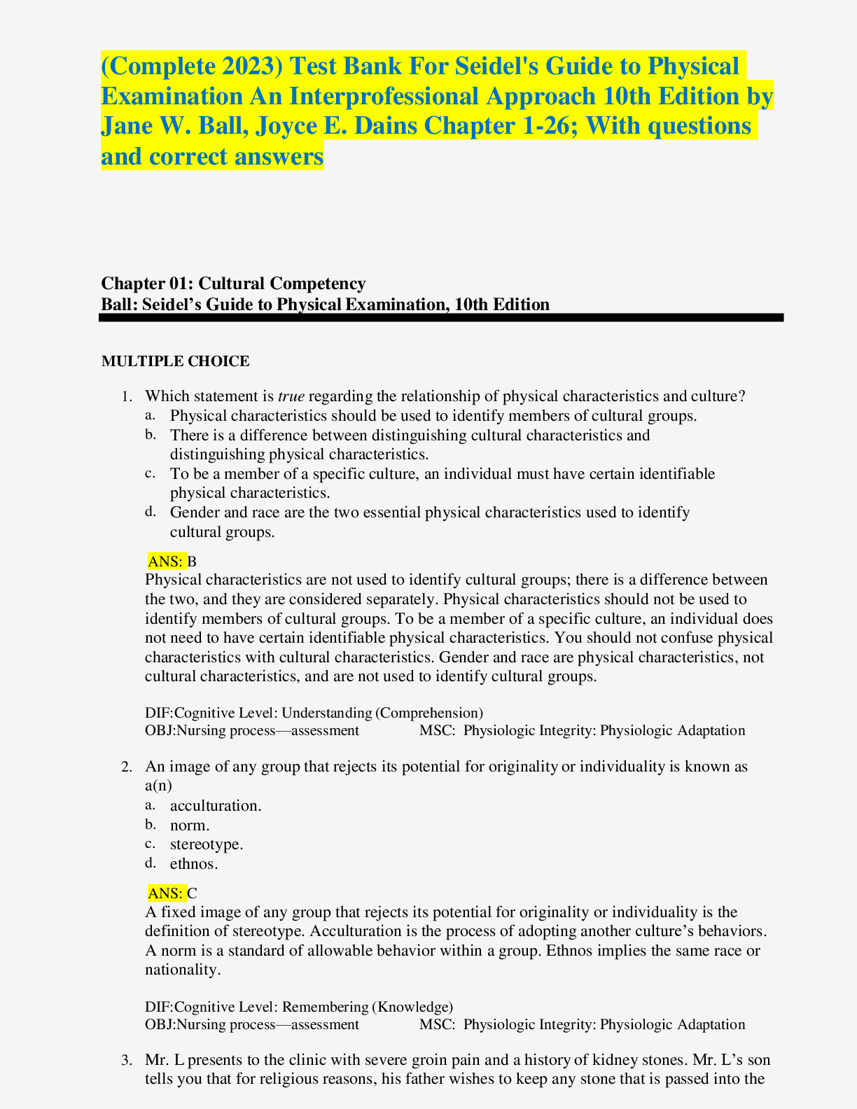 NURSING. > EXAM > (Complete 2023) Test Bank For Seidel's Guide to Physical Examination An Interprofessional Approach 10th Edition by Jane W. Ball, Joyce E. Dains Chapter 1-26; With questions and correct answers (All)