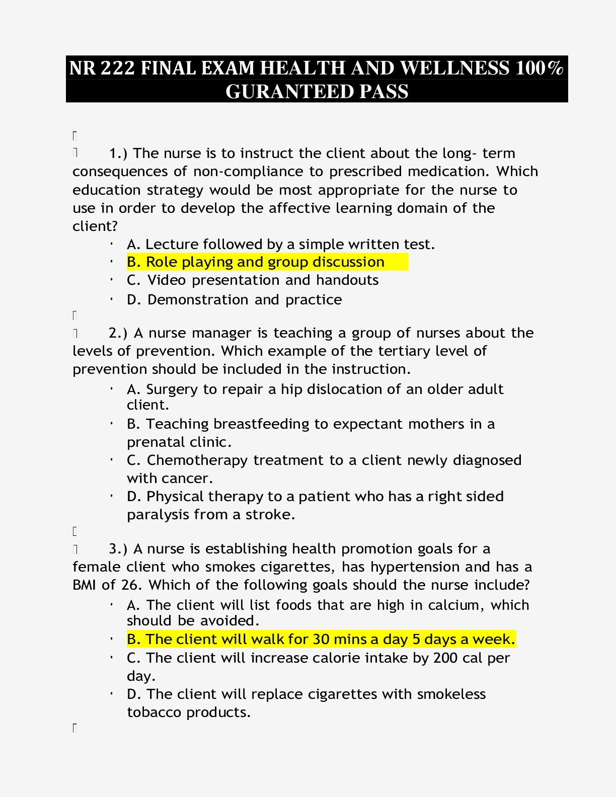NURSING. > EXAM > NR 222 FINAL EXAM HEALTH AND WELLNESS 100% GURANTEED PASS (All)