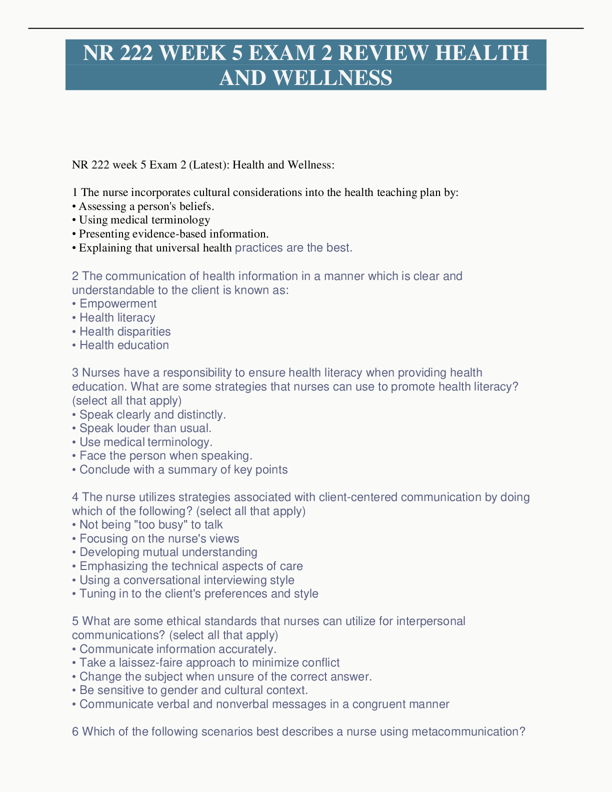NURSING. > EXAM > NR 222 EXAM 2 REVIEW HEALTH AND WELLNESS (All)