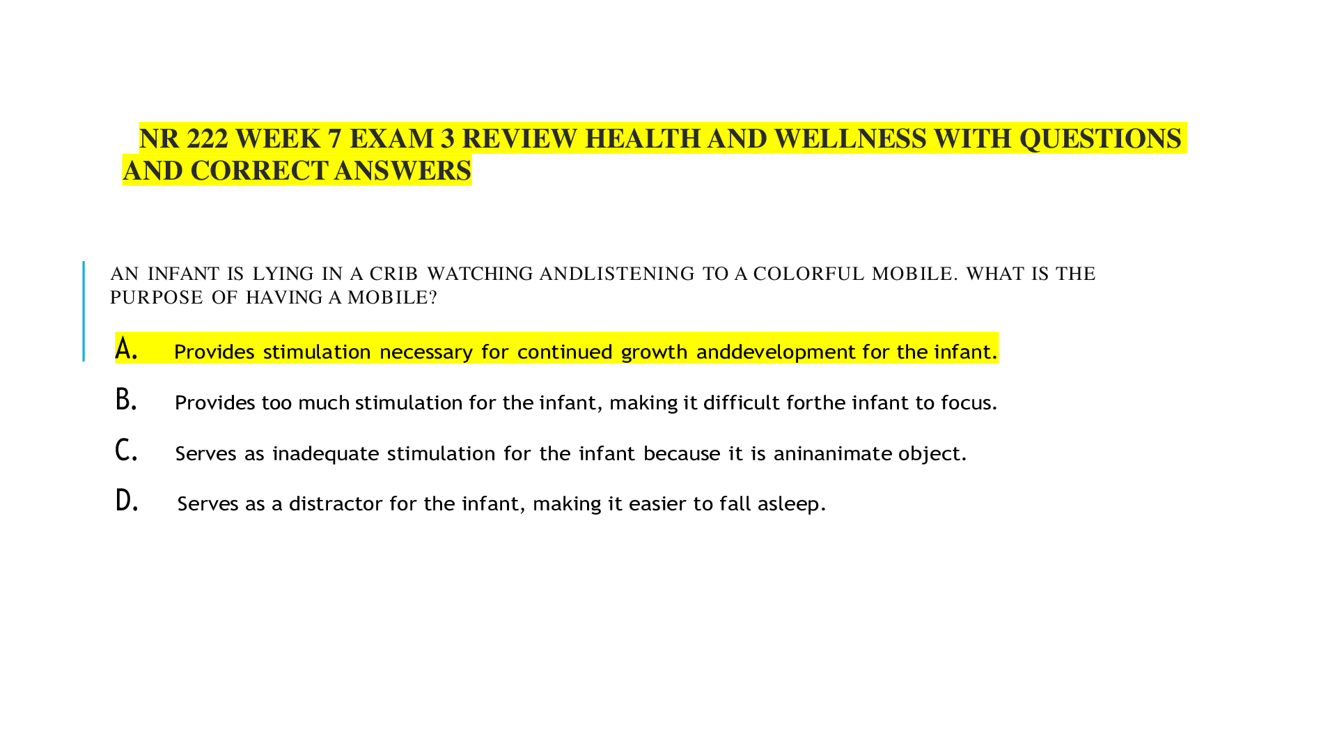 NURSING. > EXAM > NR 222 Week 6 Exam Review Health And Wellness Questions And Correct Answers (All)