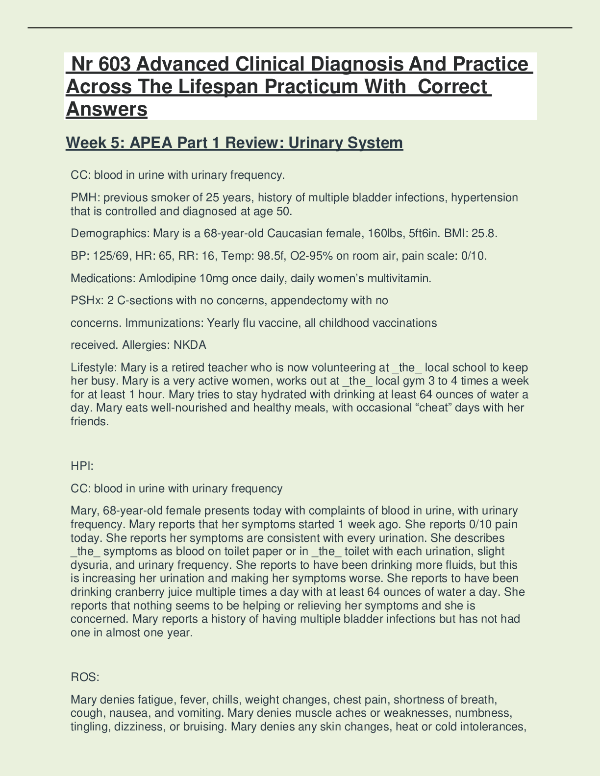 NURSING. > EXAM > Nr 603 Advanced Clinical Diagnosis And Practice Across The Lifespan Practicum With Correct Answers Week 5: APEA Part 1 Review: Urinary System (All)