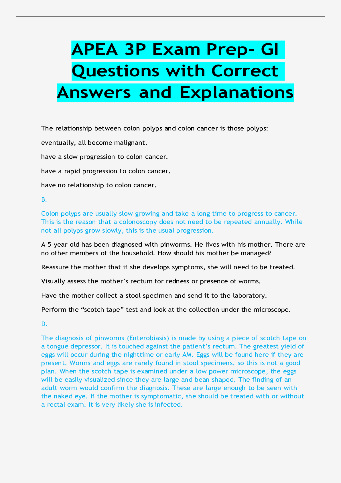 NURSING. > EXAM > APEA 3P Exam Prep- GI Questions with Correct Answers and Explanations (All)