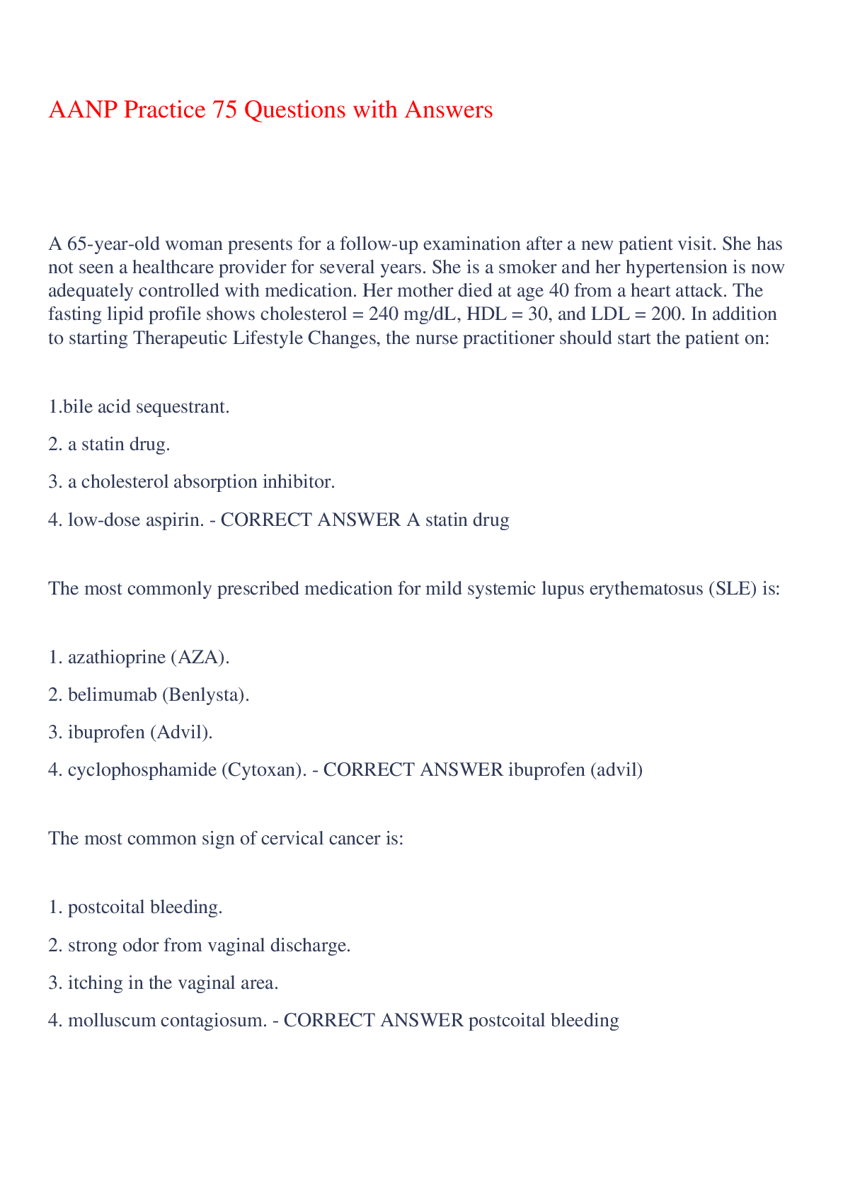 NURSING. > EXAM > AANP Practice 75 Questions with Answers,100% CORRECT (All)