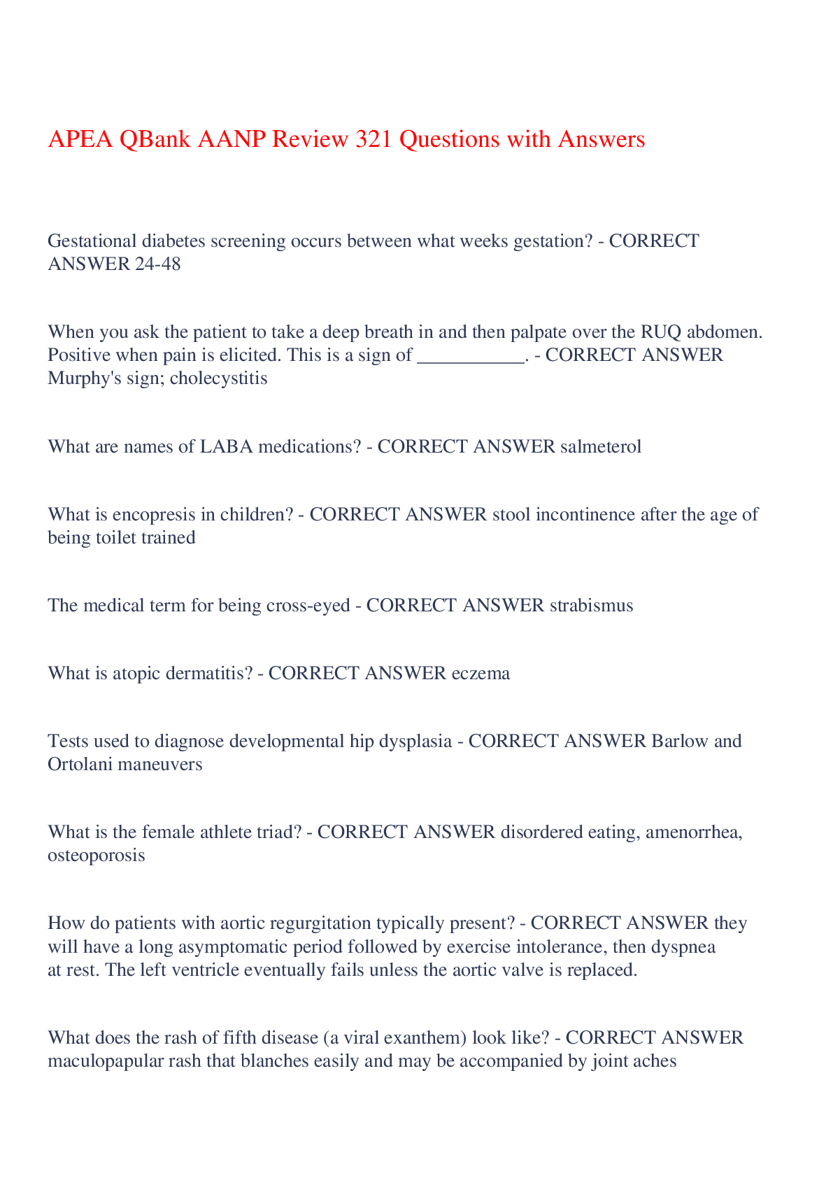 NURSING. > EXAM > APEA QBank AANP Review 321 Questions with Answers,100% CORRECT (All)