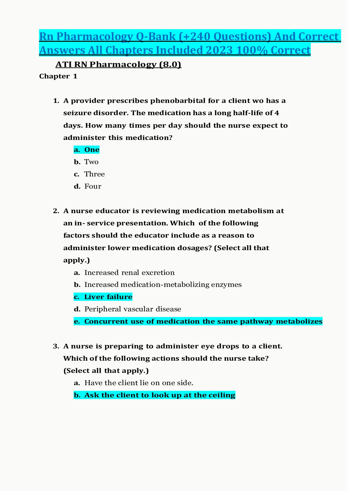 NURSING. > EXAM > Rn Pharmacology Q-Bank (+240 Questions) And Correct Answers All Chapters Included 2023 100% Correct (All)