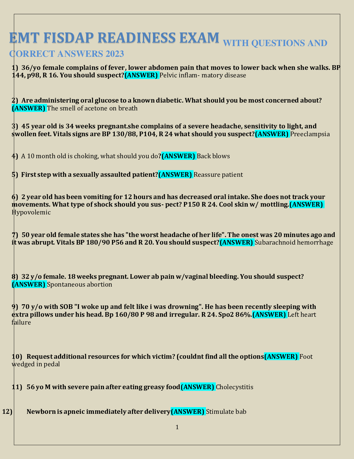 NURSING. > EXAM > EMT FISDAP Readiness Exam Questions And Answers 2023 100% Pass (All)