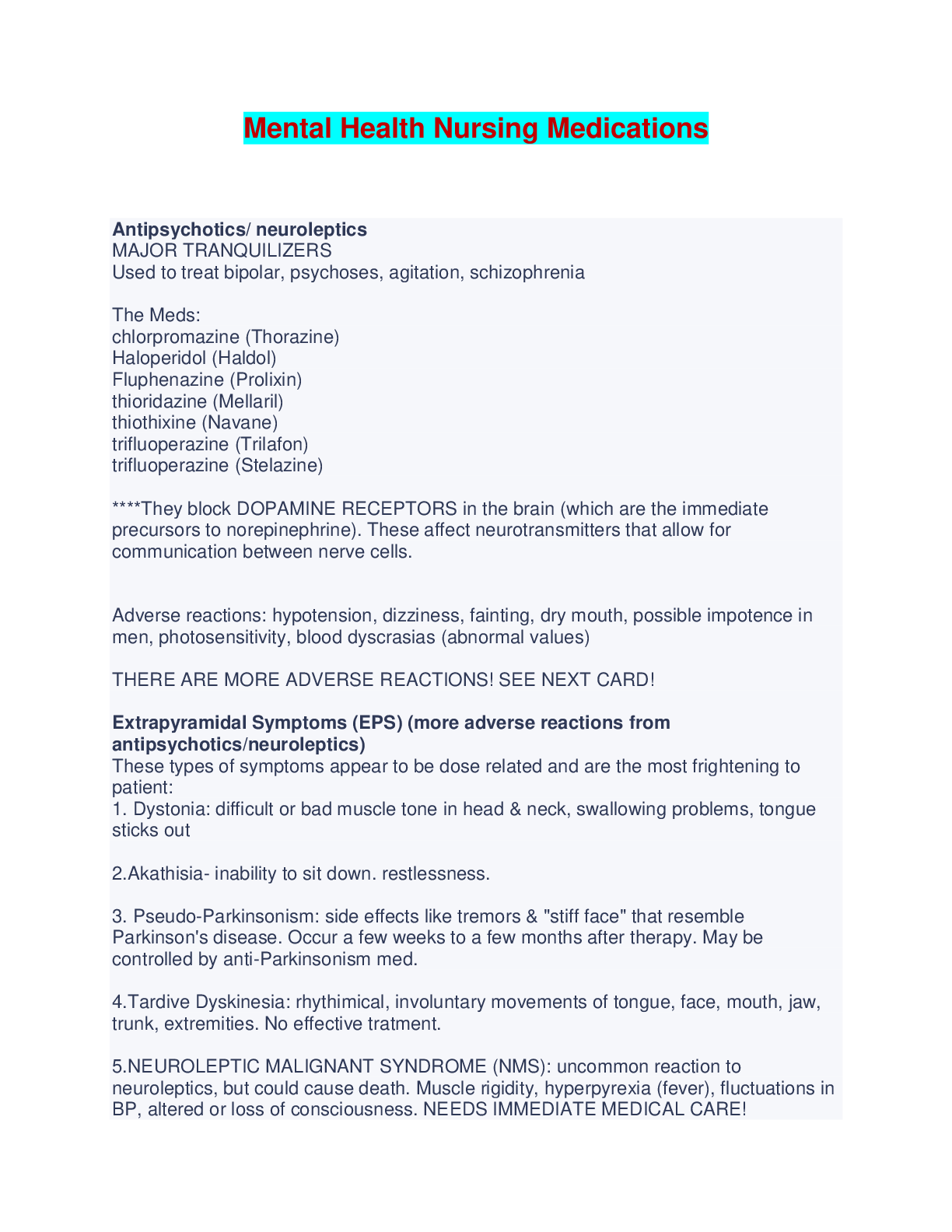 NURSING. > EXAM > Mental Health Nursing Medications - Questions and Answers (All)