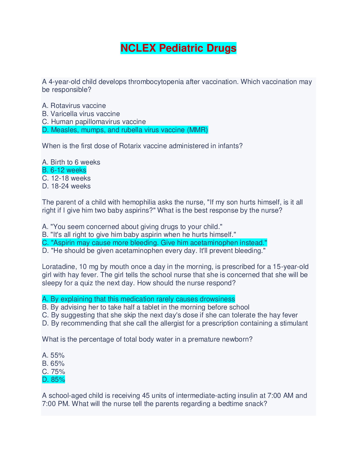 NURSING. > EXAM > NCLEX Pediatric Drugs - Questions and Answers (All)