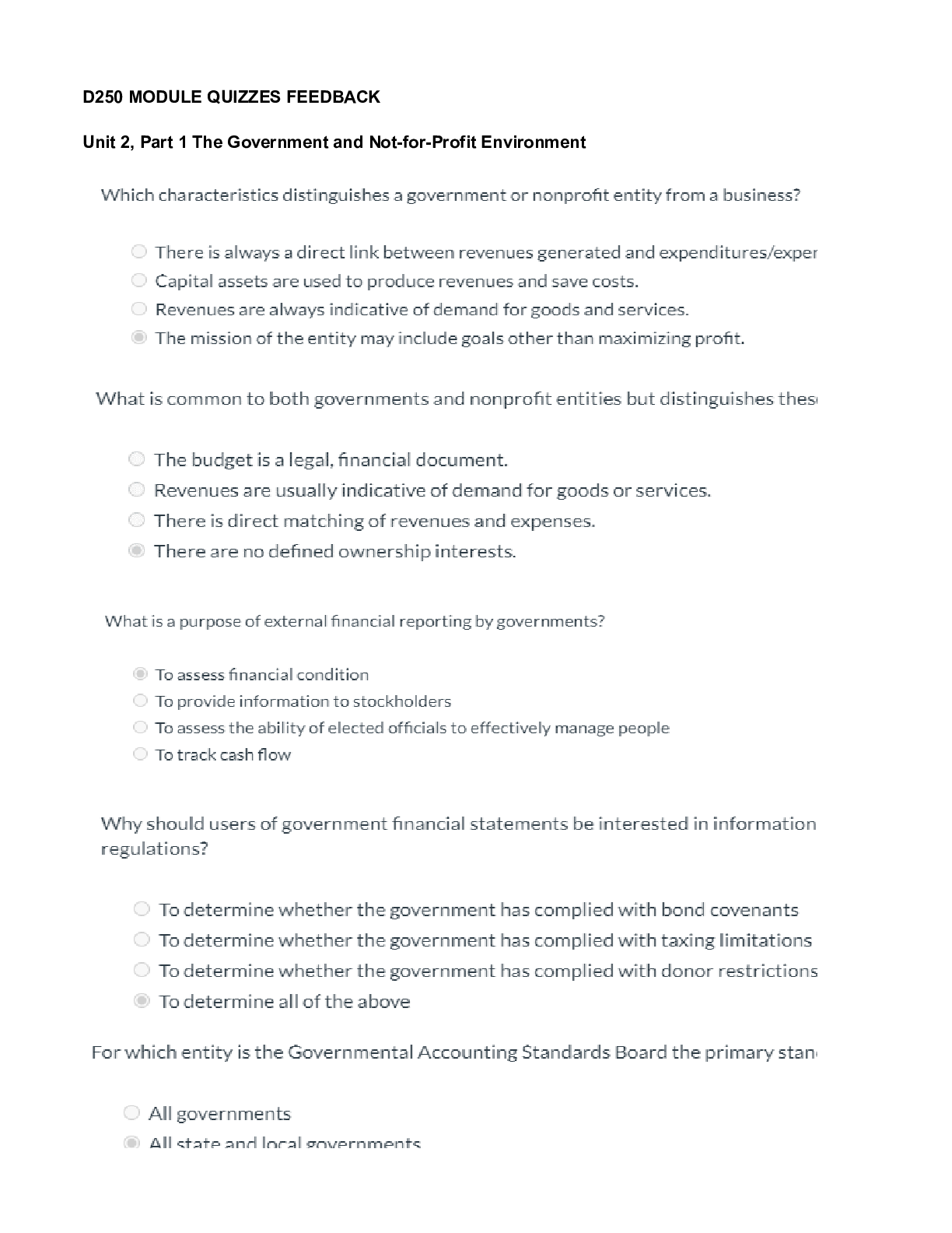 NURSING. > EXAM > D250 MODULE QUIZZES FEEDBACK Unit 2, Part 1 The Government and Not-for-Profit Environment (All)