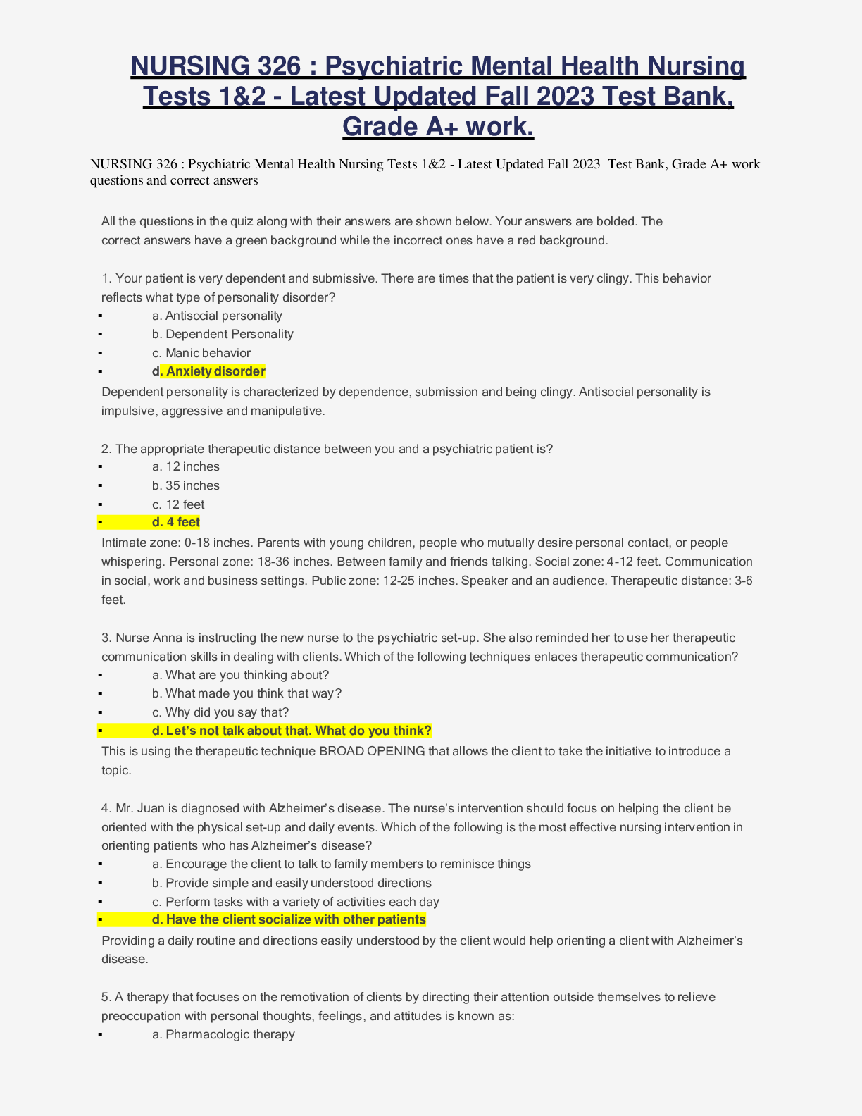 NURSING. > EXAM > NURSING 326 : Psychiatric Mental Health Nursing Tests 1&2 - Latest Updated Fall 2023 Test Bank, Grade A+ work questions and correct answers (All)