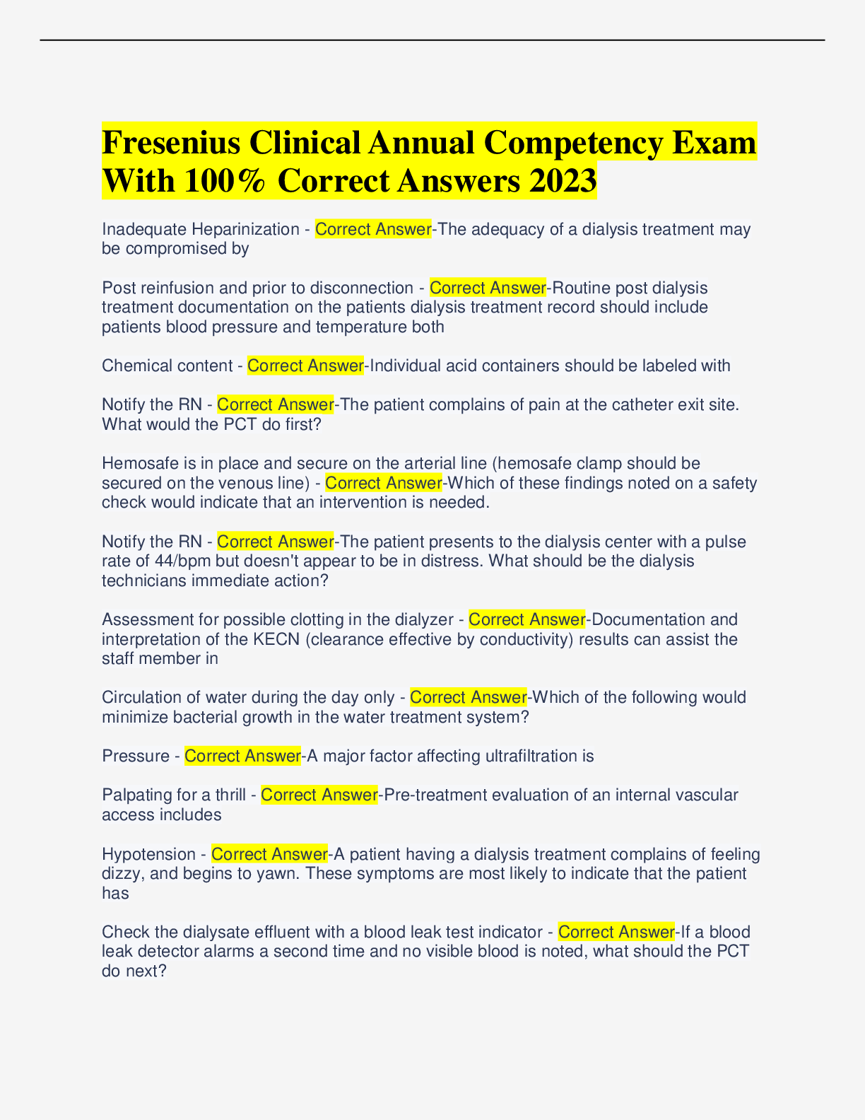 NURSING. > EXAM > Fresenius Clinical Annual Competency Exam With 100% Correct Answers 2023 (All)