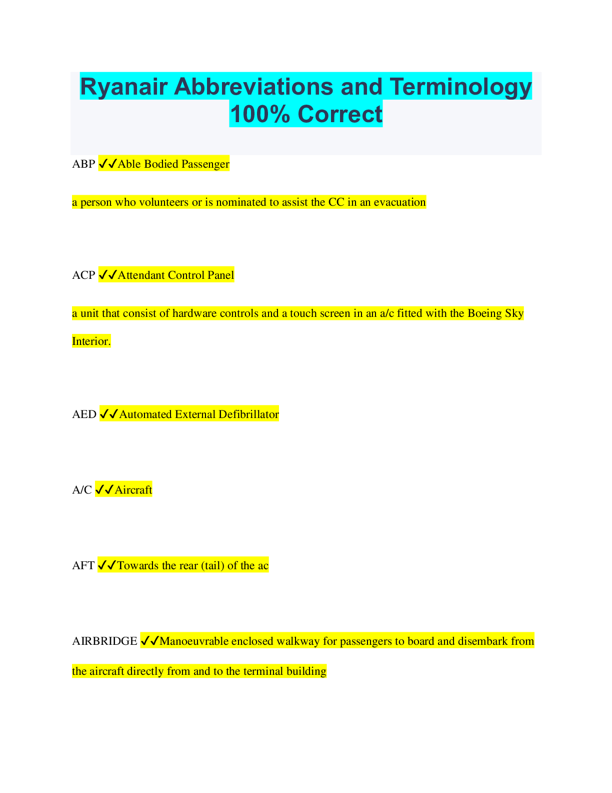 Ryanair security > QUESTIONS & ANSWERS > Ryanair Abbreviations and Terminology 100% Correct (All)