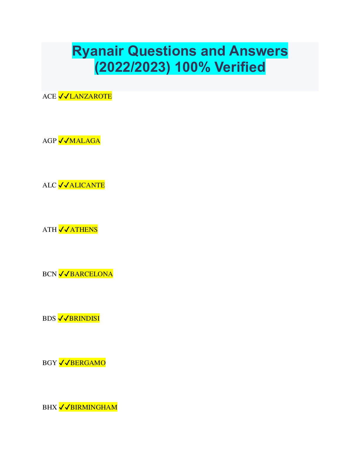 Ryanair security > QUESTIONS & ANSWERS > Ryan air Practice Questions (2022/2023) with Verified Solutions (All)