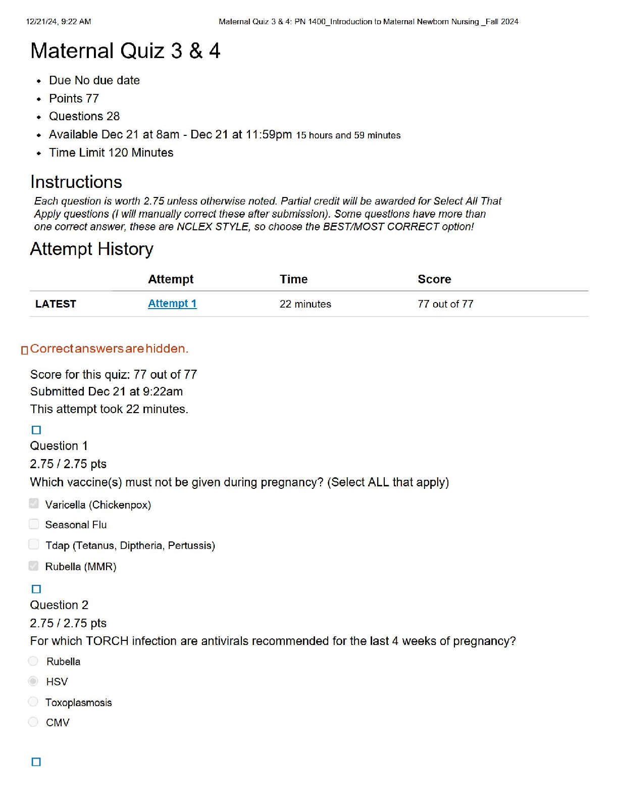 Maternal Child Nursing Care > QUESTIONS and ANSWERS > PN 1400 Maternal Newborn Nursing – Quiz 3 & 4 Study Guide with Questions & Answers (Fall 2024) (All)