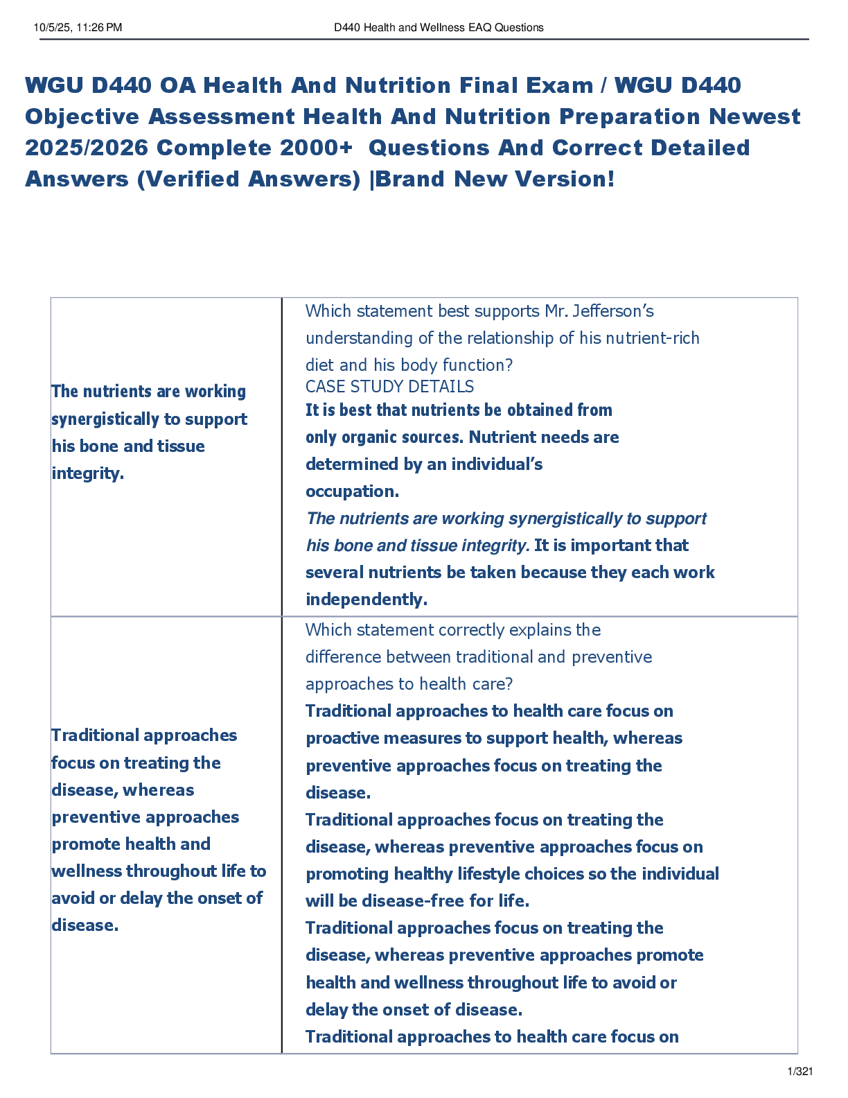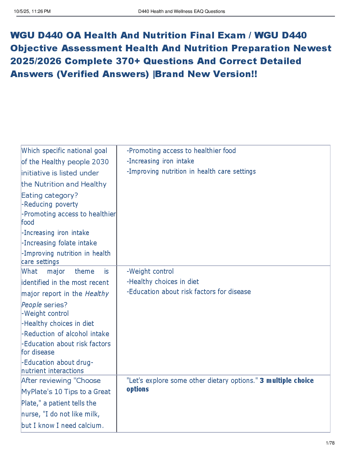 ATI - RN Nutrition > FINAL EXAM > WGU D440 OA Health And Nutrition Final Exam / WGU D440 Objective Assessment Health And Nutrition Preparation Newest 2025/2026 Complete 2000+ Questions And Correct Detailed Answers (Verified Answers) |Brand New Version! (All)