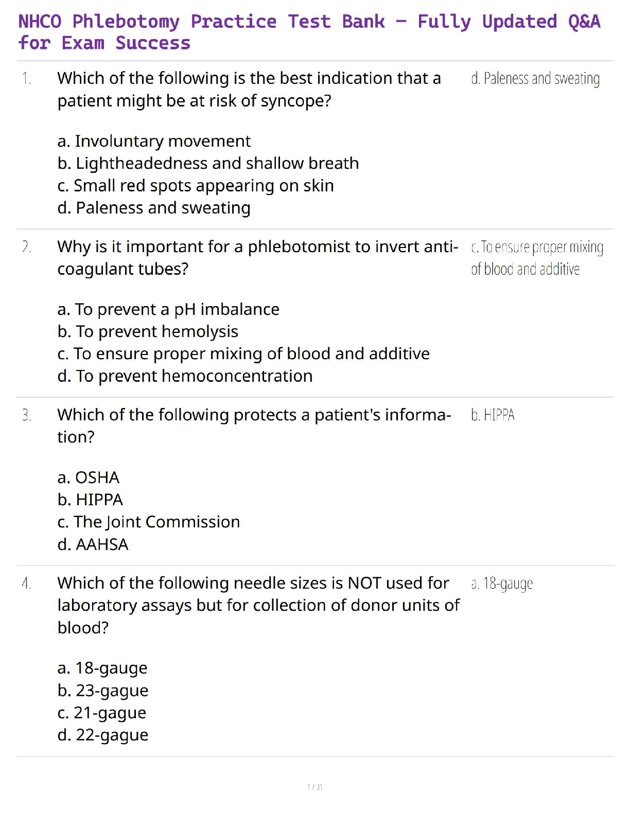 NHA phlebotomy > QUESTIONS & ANSWERS > Phlebotomy Mock Certification Exam (Questions 176-200) / NHA, ASCP Prep / 2025 Study Guide / Score 100% / Test Bank (All)