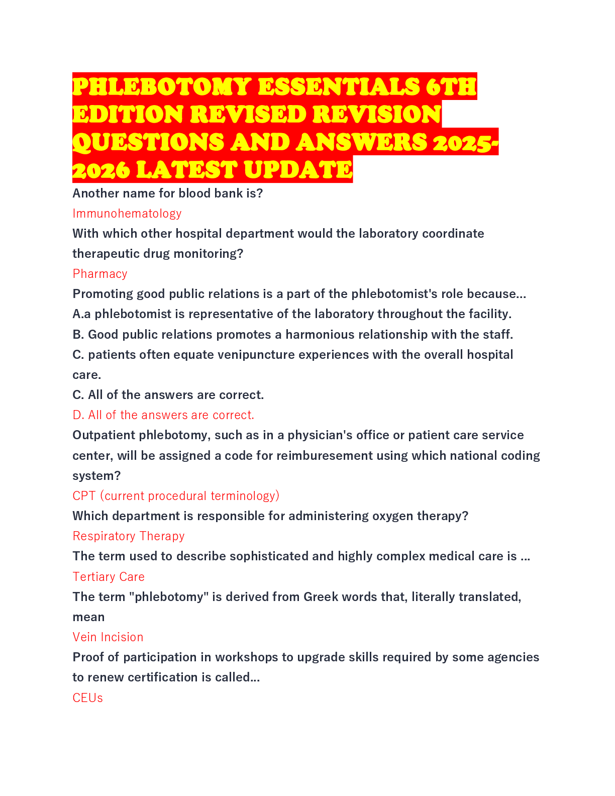 NHA phlebotomy > EXAMs > PHLEBOTOMY ESSENTIALS 6TH EDITION REVISED REVISION QUESTIONS AND ANSWERS 2025-2026 LATEST UPDATE (All)