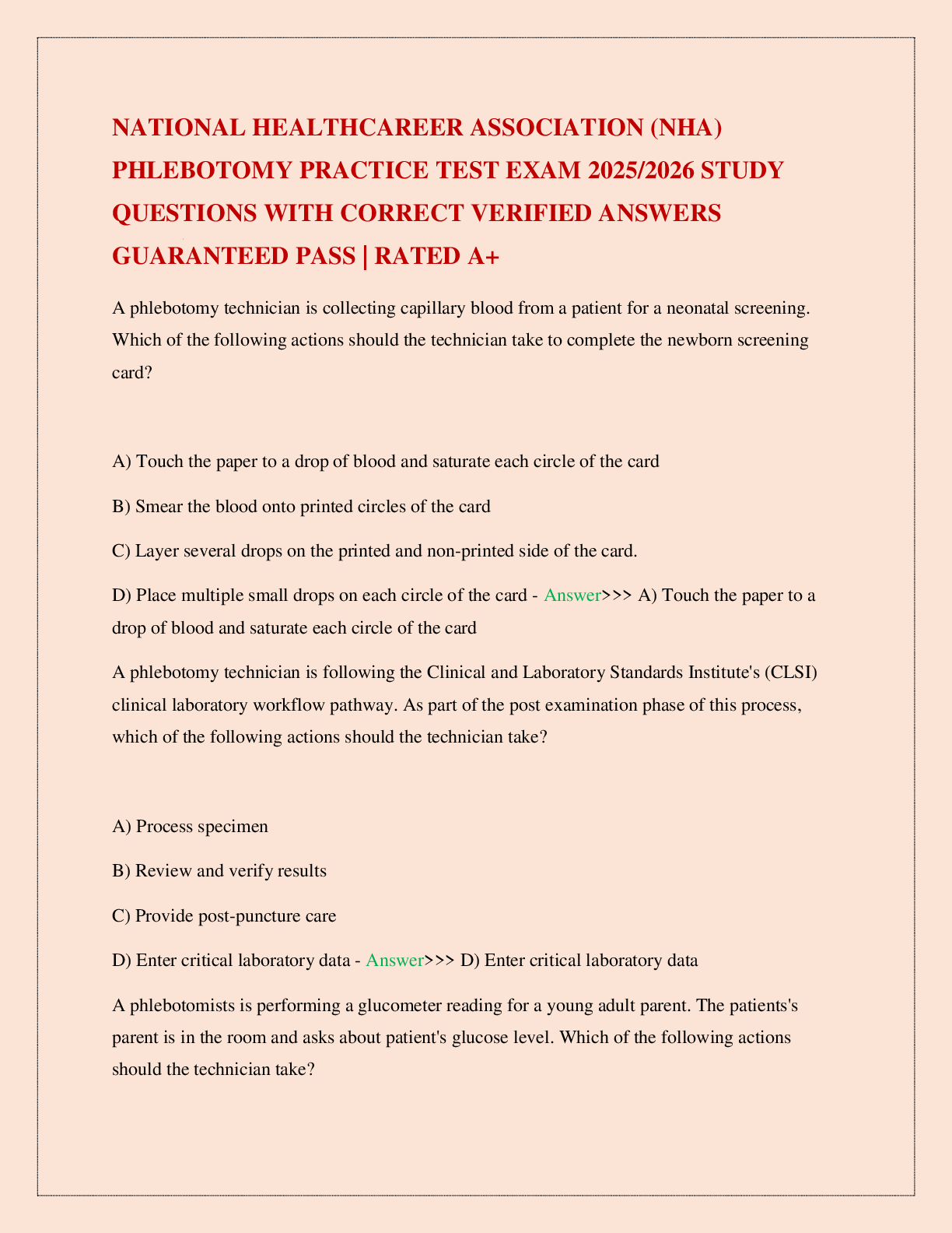 NHA phlebotomy > EXAMs > NATIONAL HEALTHCAREER ASSOCIATION (NHA) PHLEBOTOMY PRACTICE TEST EXAM 2025/2026 STUDY QUESTIONS WITH CORRECT VERIFIED ANSWERS GUARANTEED PASS | RATED A+ (All)