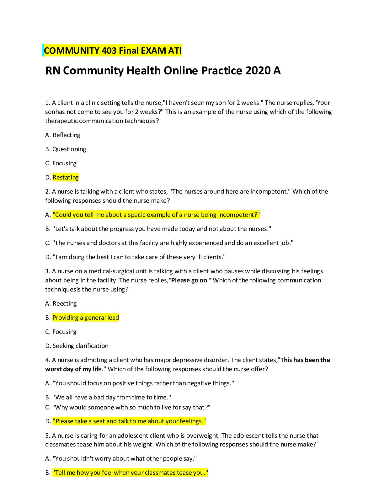 *NURSING > QUESTIONS and ANSWERS > ATI-Community Health Proctored Test bank for 2020.2021-Highlighted Responses-100% (All)