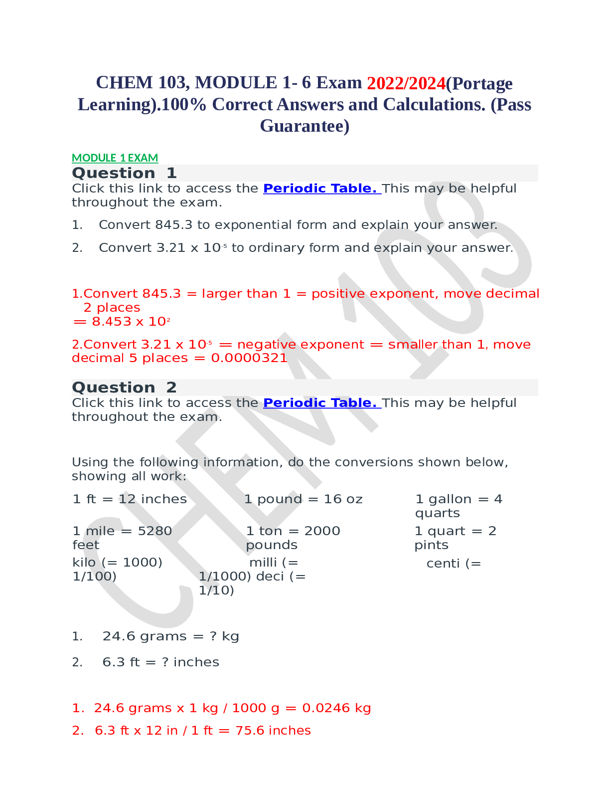 *NURSING > EXAM > CHEM 103 MODULE 1- 6 Exam 2022-2024 (Portage Learning).100 Correct Answers and Calculations (All)