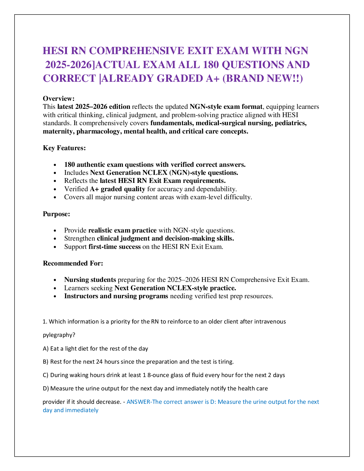 *NURSING > EXAM > HESI RN COMPREHENSIVE EXIT EXAM WITH NGN 2025-2026]ACTUAL EXAM ALL 180 QUESTIONS AND CORRECT |ALREADY GRADED A+ (BRAND NEW!!) (All)
