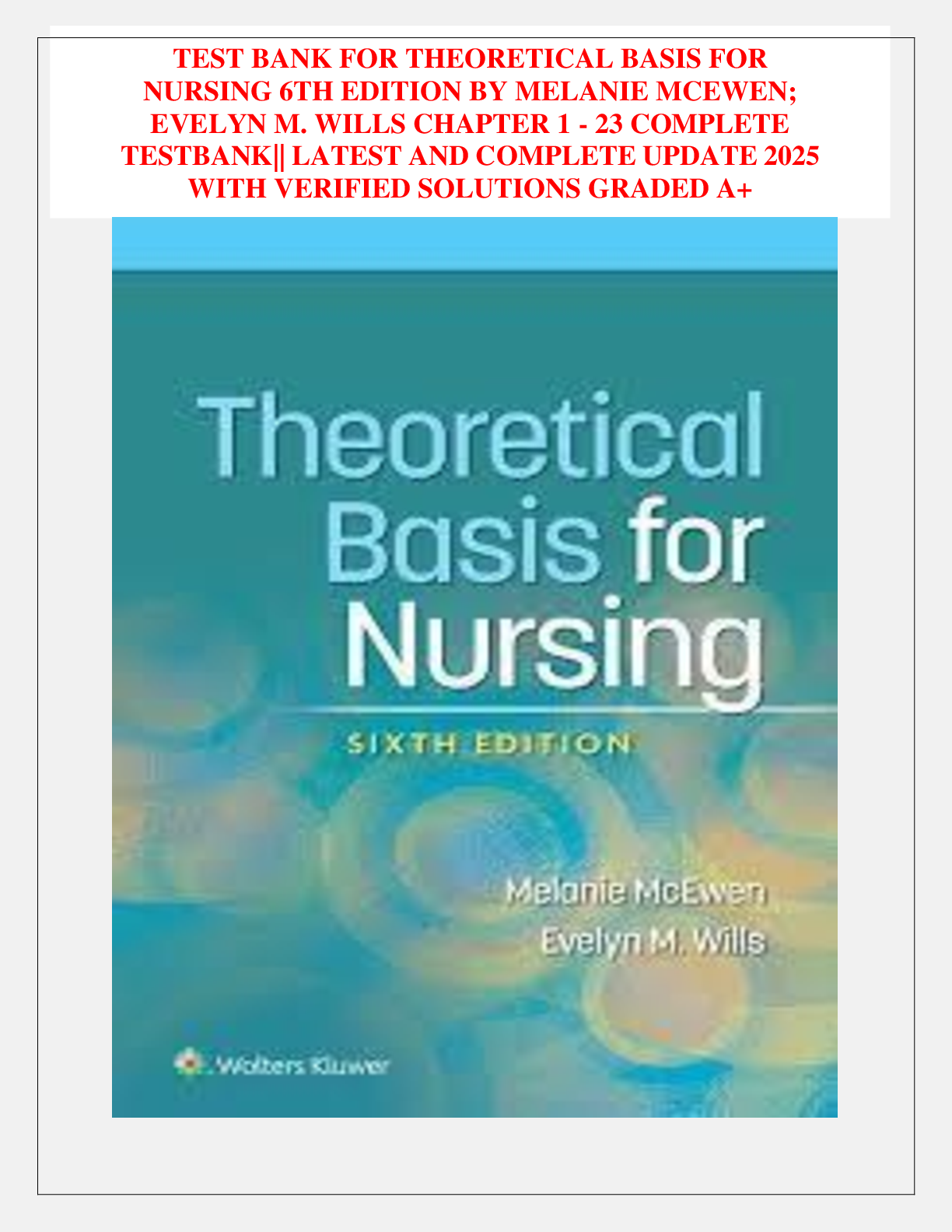 *NURSING > TEST BANKS > TEST BANK FOR THEORETICAL BASIS FOR NURSING 6TH EDITION BY MELANIE MCEWEN; EVELYN M. WILLS CHAPTER 1 - 23 COMPLETE TESTBANK|| LATEST AND COMPLETE UPDATE 2025 WITH VERIFIED SOLUTIONS GRADED A+ (All)