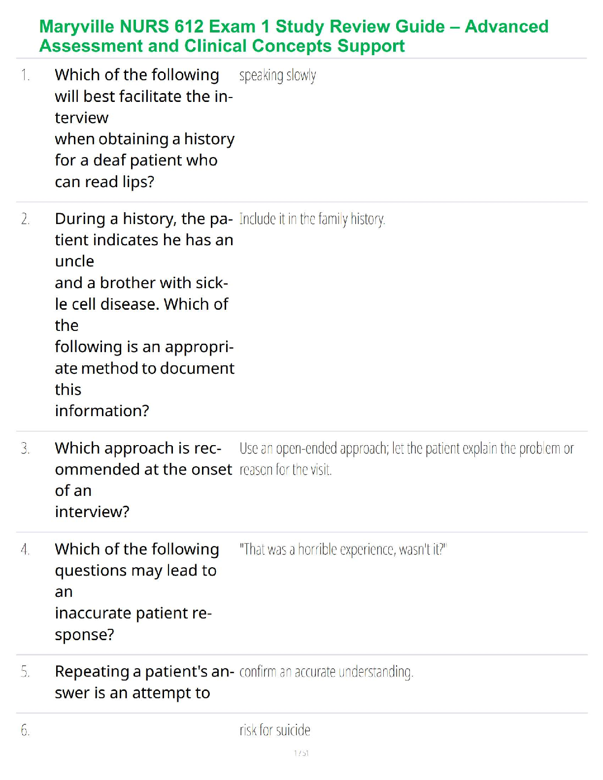 *NURSING > STUDY GUIDE > Maryville NURS 612 Exam 1 Study Review Guide – Advanced Assessment and Clinical Concepts Support (All)