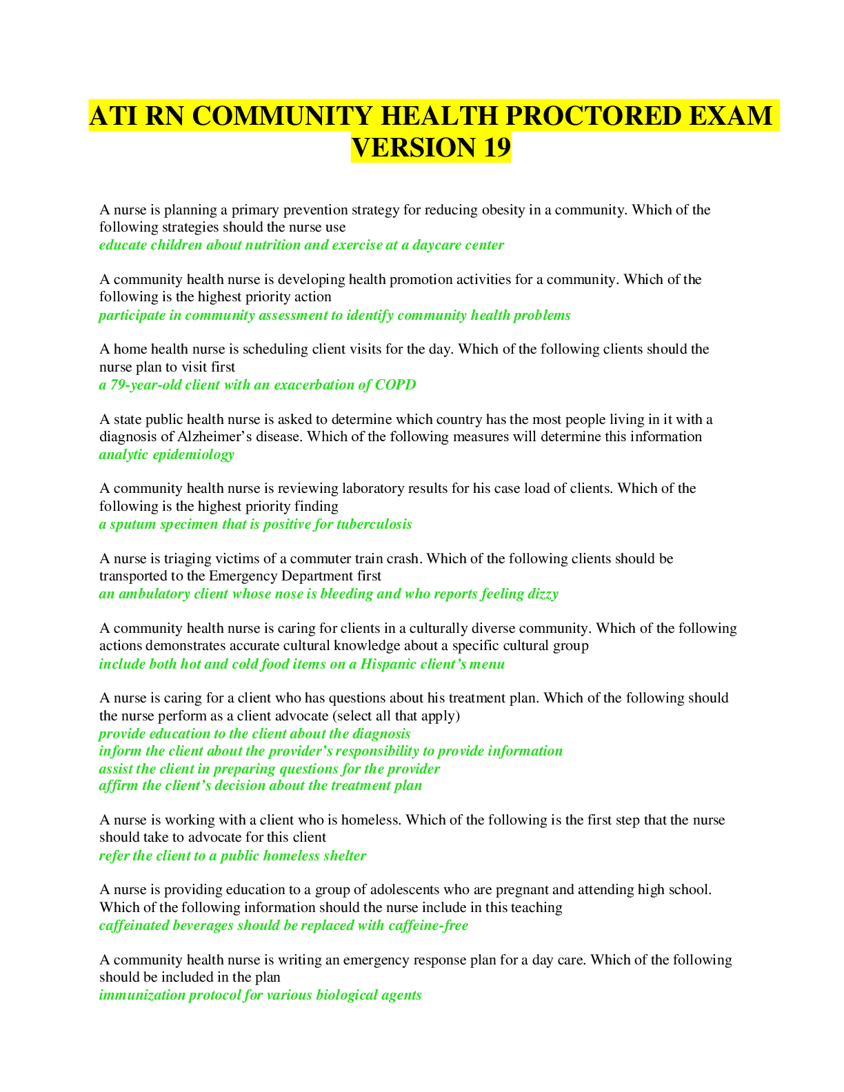 *NURSING > ATI > ATI RN Community Health Proctored Exam Version 19 Complete Questions & Answers with Rationale (All)