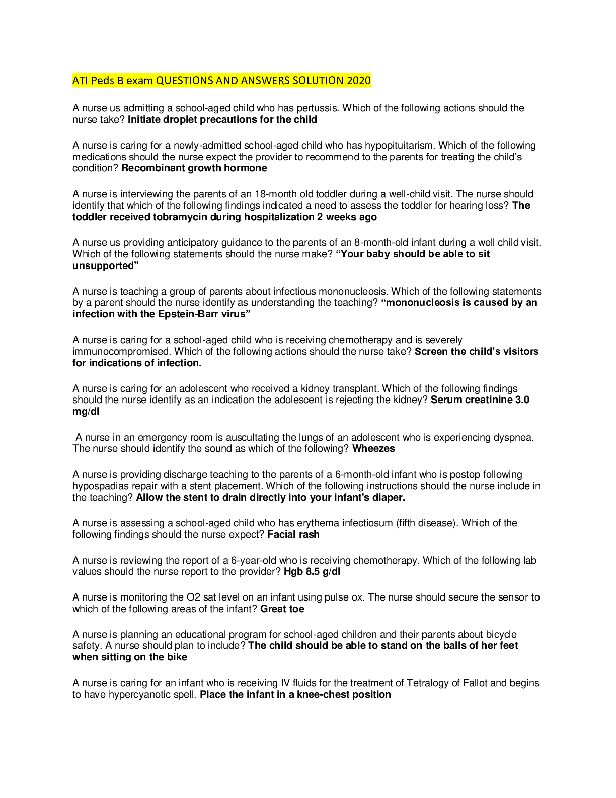 *NURSING > QUESTIONS & ANSWERS > ATI Peds B exam QUESTIONS AND ANSWERS SOLUTION 2020 (All)
