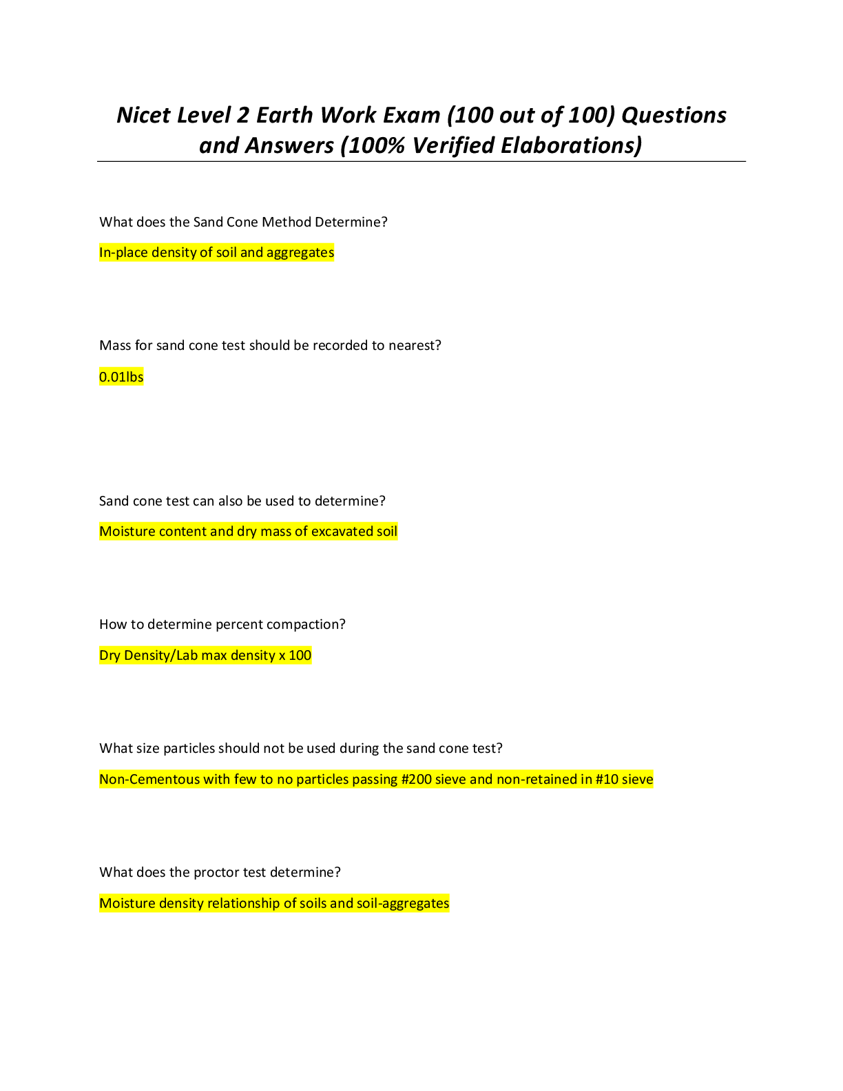 *NURSING > EXAM > Nicet Level 2 Earth Work Exam (100 out of 100) Questions and Answers (100% Verified Elaborations)